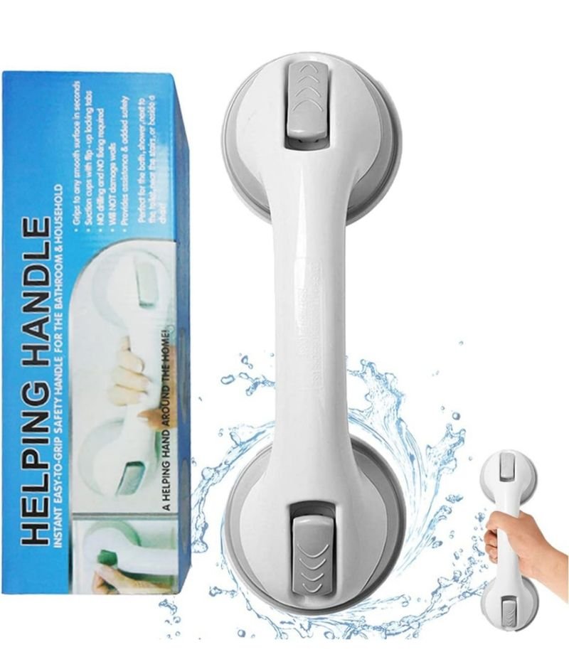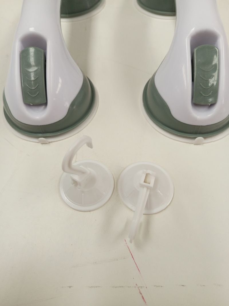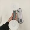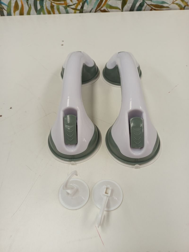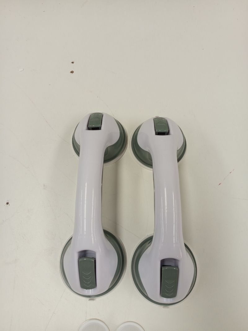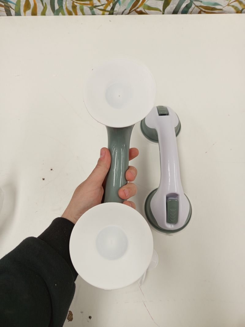 agarraderas de ventosa para baño o ducha, ideales para personas mayores o con movilidad reducida. Son blancas y grises, y parecen estar en buen estado.