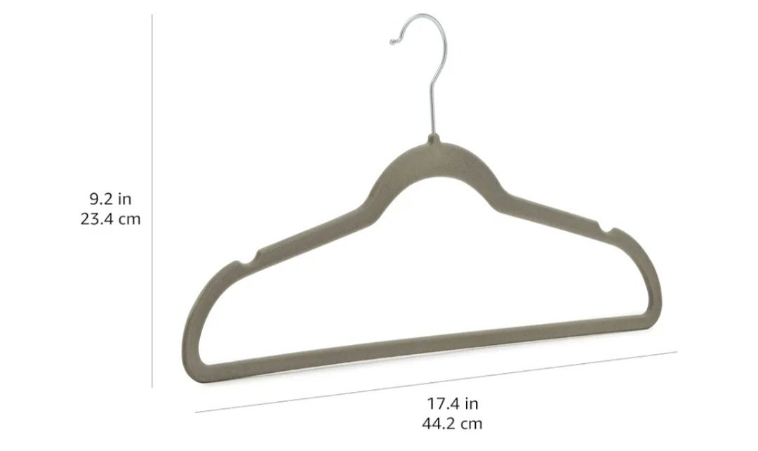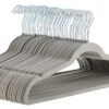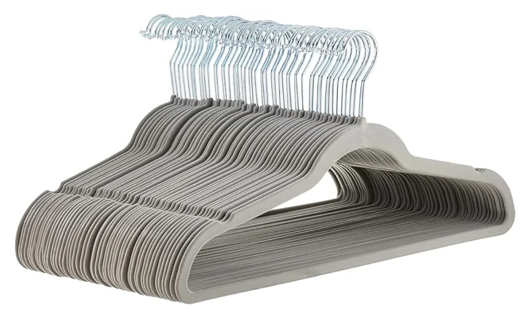 Amazon Basics Paquete de 48 perchas, antideslizantes, delgadas, con acabado de terciopelo, color gris Superficie de terciopelo gris con muescas antideslizantes en las hombreras para evitar que la ropa se escurra.