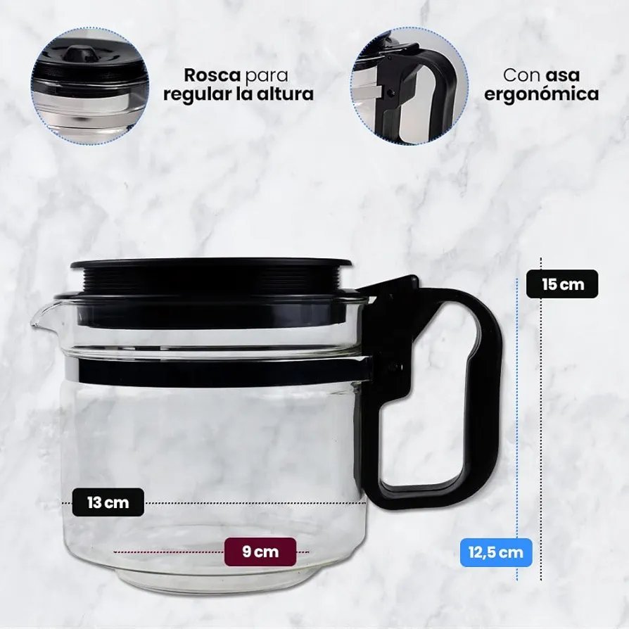 ✔️ ALTURA REGULABLE | La altura de la jarra se puede regular entre 12,5 y 15 cm* para adaptarse a diferentes cafeteras. La base de la cafetera es de 9 cm de diámetro (para el encaje con la cafetera) y el diámetro grande, de 13 cm. *Tenga en cuenta que la altura corresponde a la medida incluyendo el encaje con la cafetera.