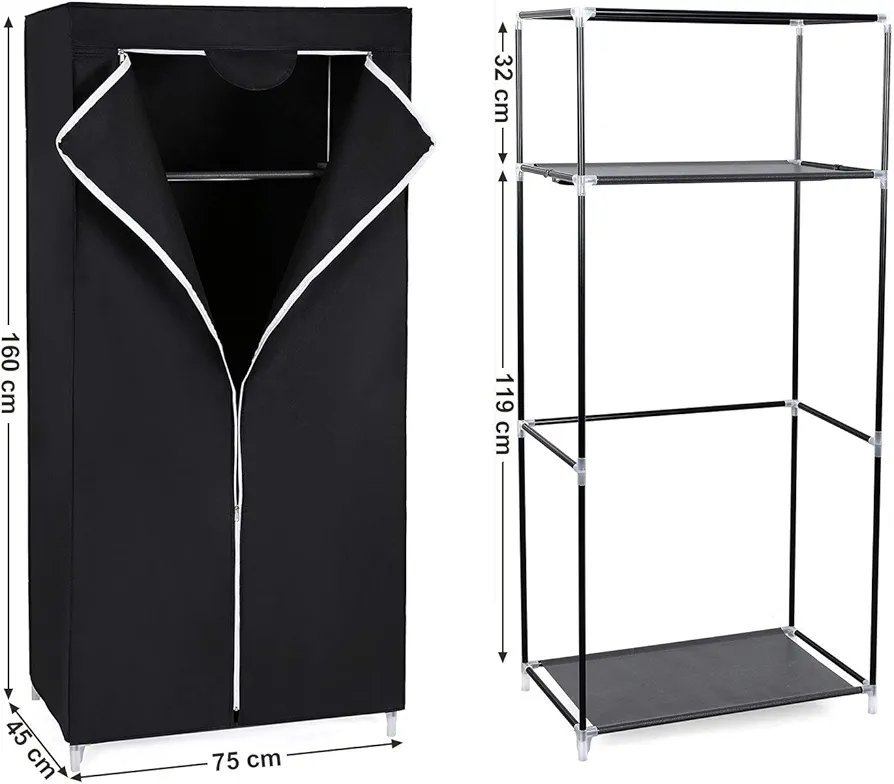 La barra de colgar tiene una capacidad de carga de 15 kg y la capa de tejido puede soportar 5 kg porque está soportada por tubos de metal de 16 mm de diámetro y un tejido no tejido de 95 g/m²; la robustez y durabilidad del armario de tela están aseguradas