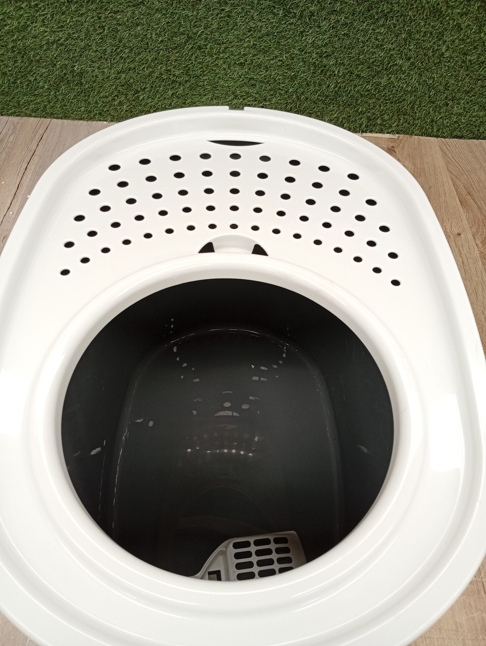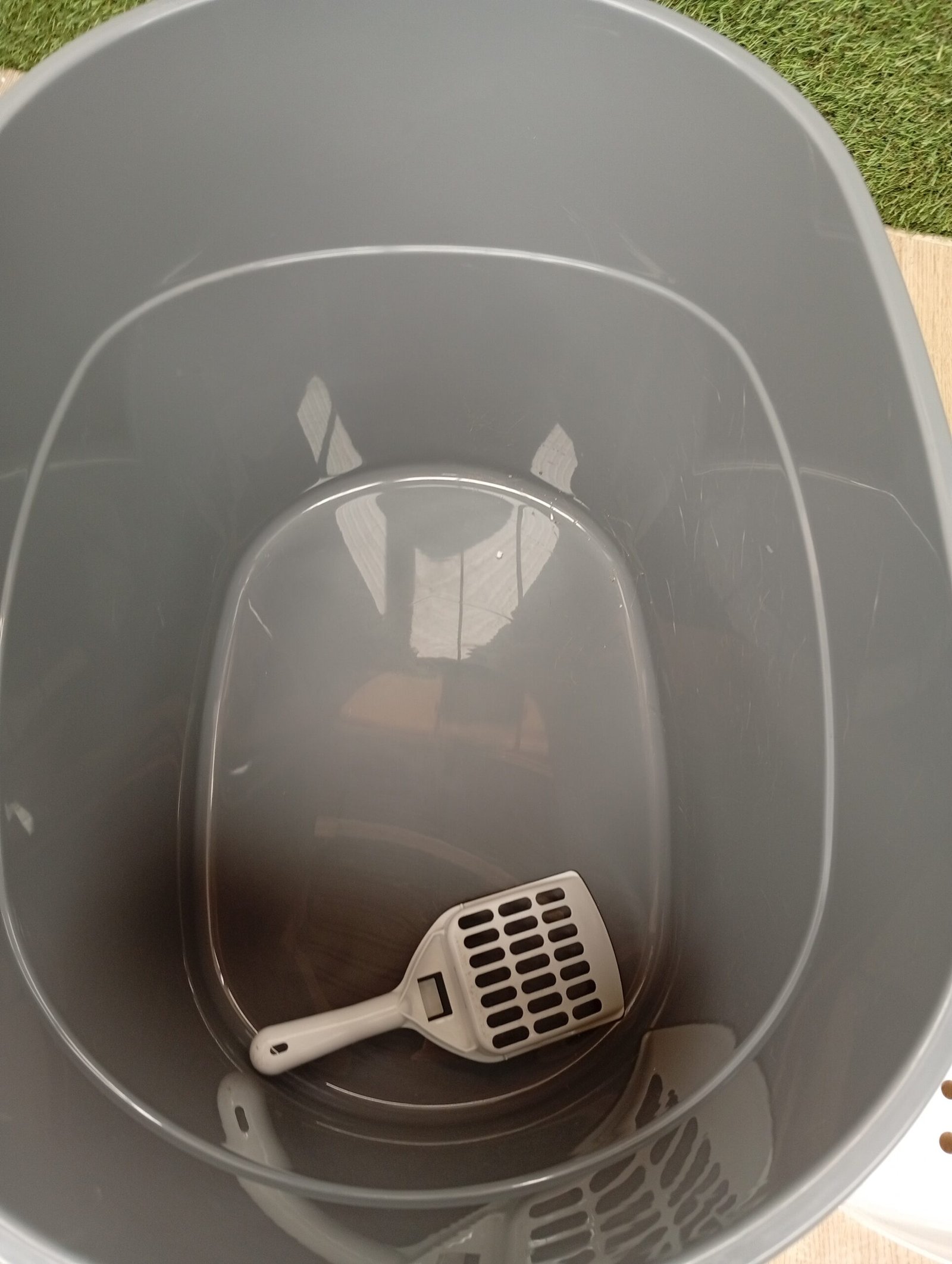La bandeja sanitaria para gatos está diseñada para integrarse a la perfección con la decoración de tu hogar. Gracias al gancho, puedes retirar fácilmente la pala después de limpiarla.