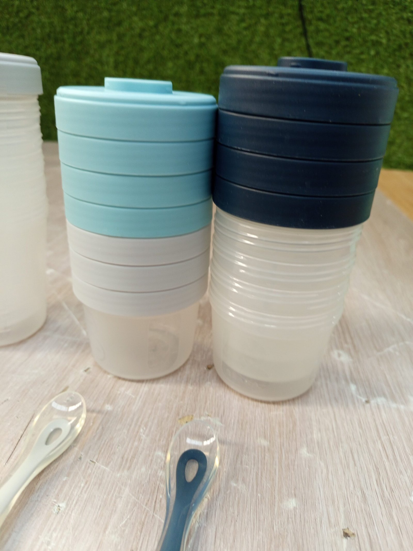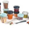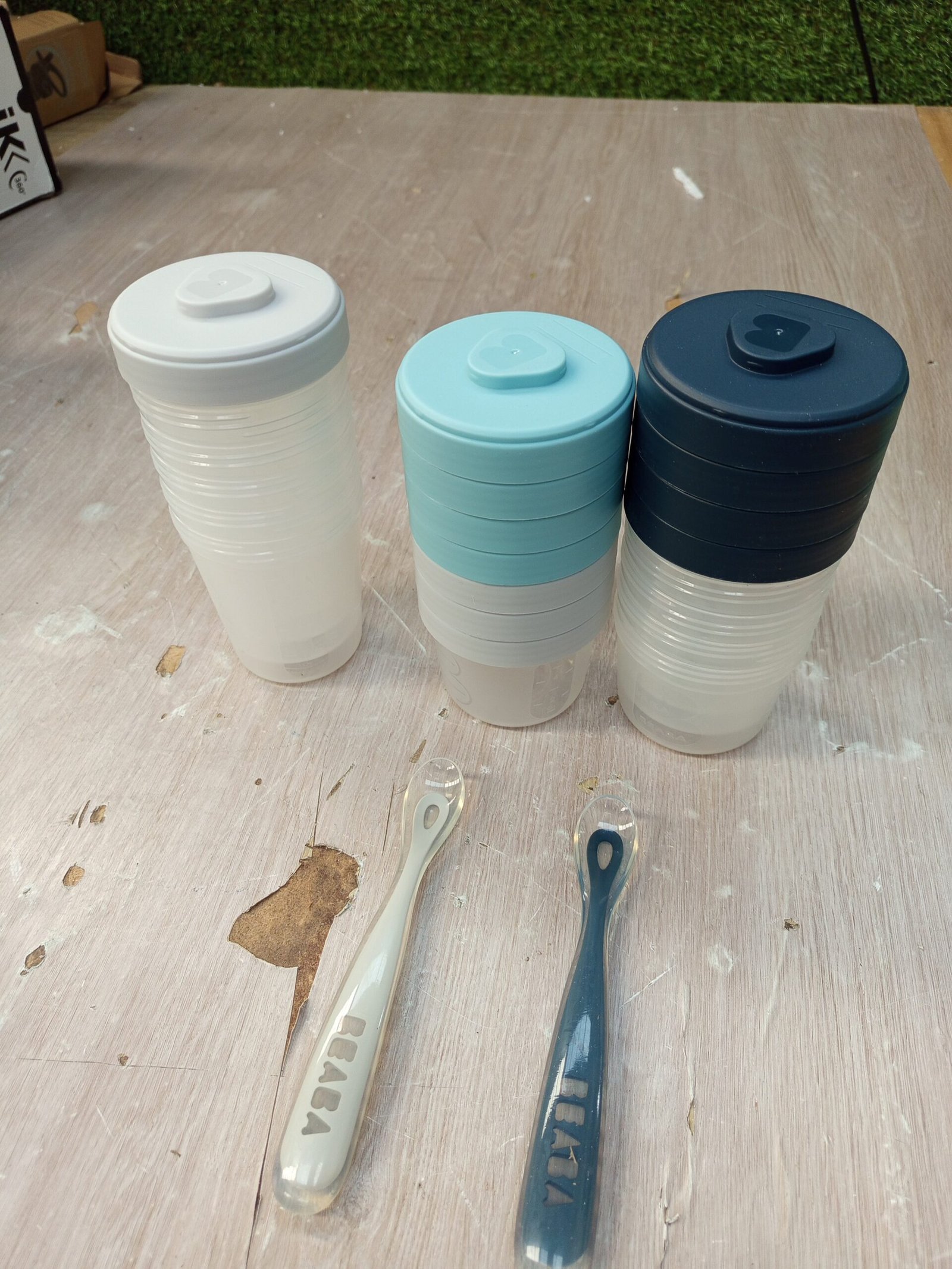 Béaba Lote de 12 Tarros de Conservación y 2 Cucharas de aprendizaje en Silicona, 100% Herméticos, Congelación, Leche Materna, 2 x 90 ml + 4 x 150 ml + 6 x 250 ml, Multicolor