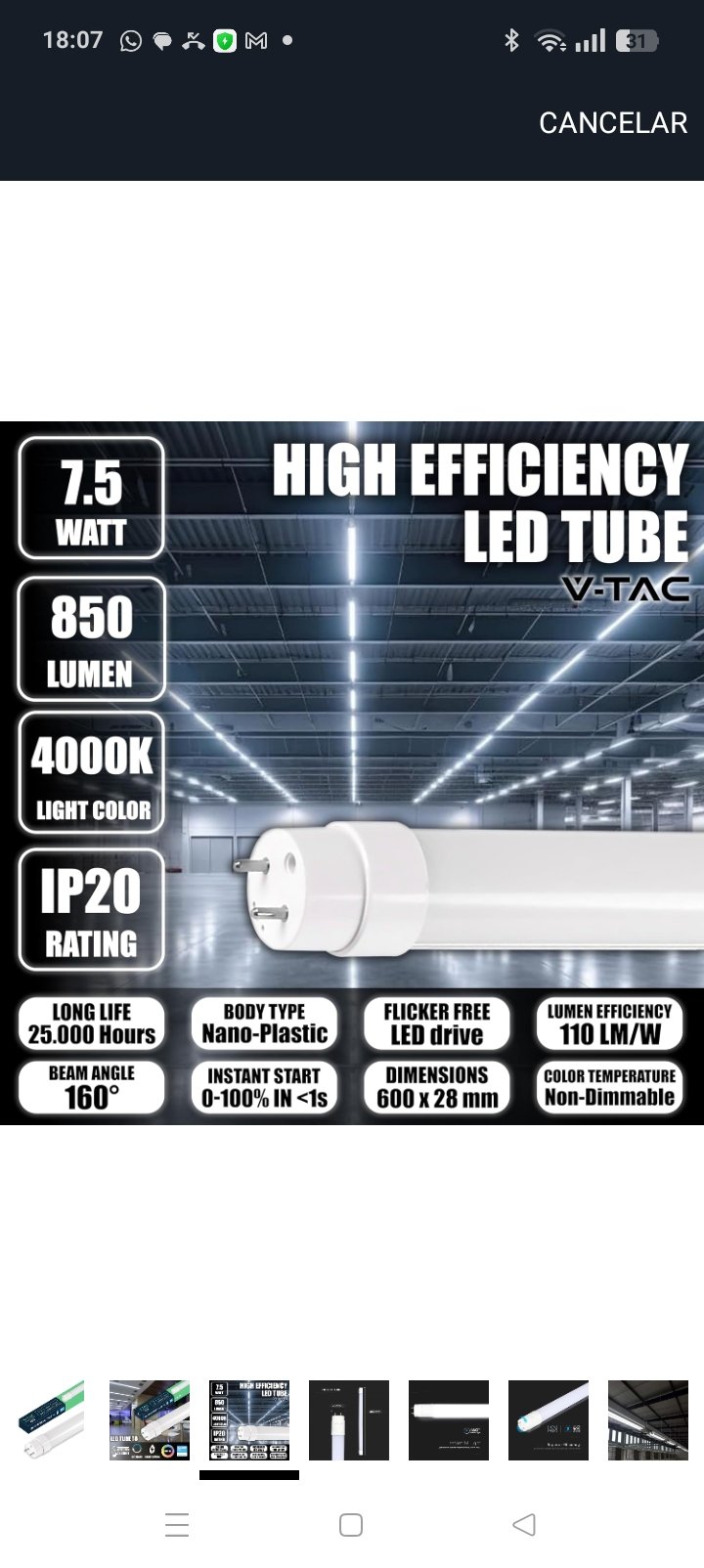 V-TAC Tubo LED 60 CM – T8 G13-7,5W – 850 Lúmenes – Chip Samsung – Tubos LED para Techo, Pared, Garaje, Tienda – Tubo LED forma T8 – Sustitución de neón – Luz 4000K Blanco Natural