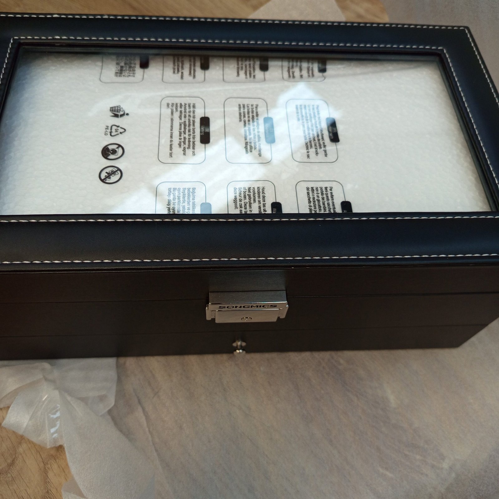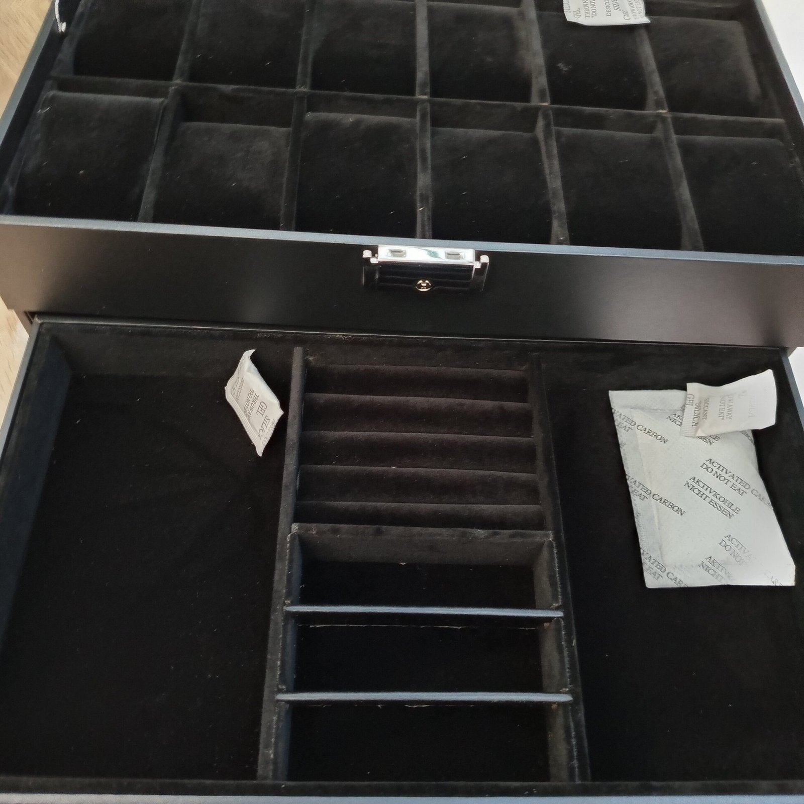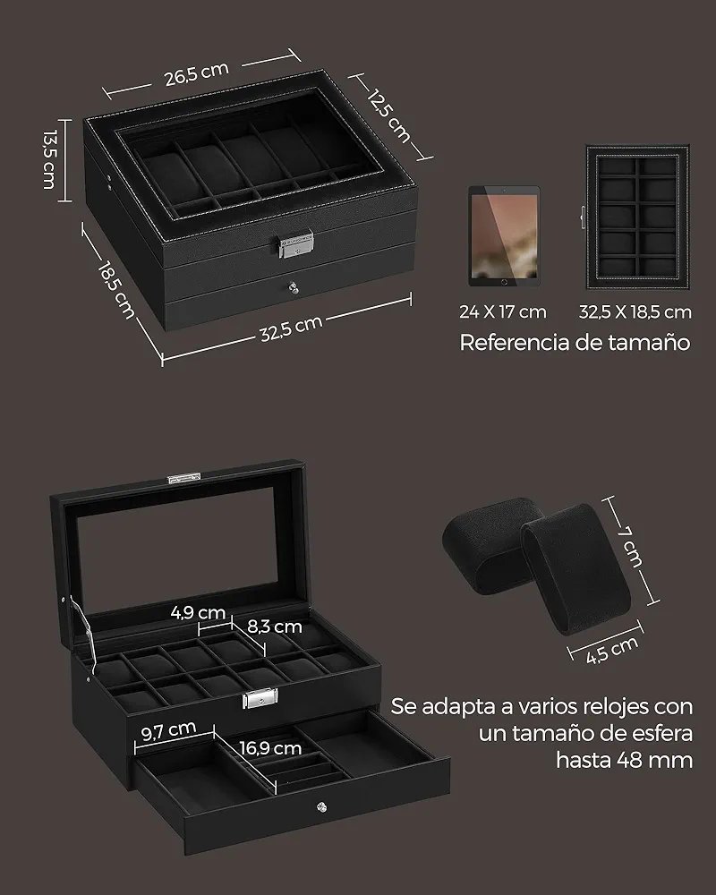 Esta caja para relojes cuenta con 12 ranuras en la parte superior para relojes con un tamaño de pantalla de hasta 48 mm. Varios compartimentos en el cajón inferior pueden almacenar tus anillos, pulseras y otras joyas