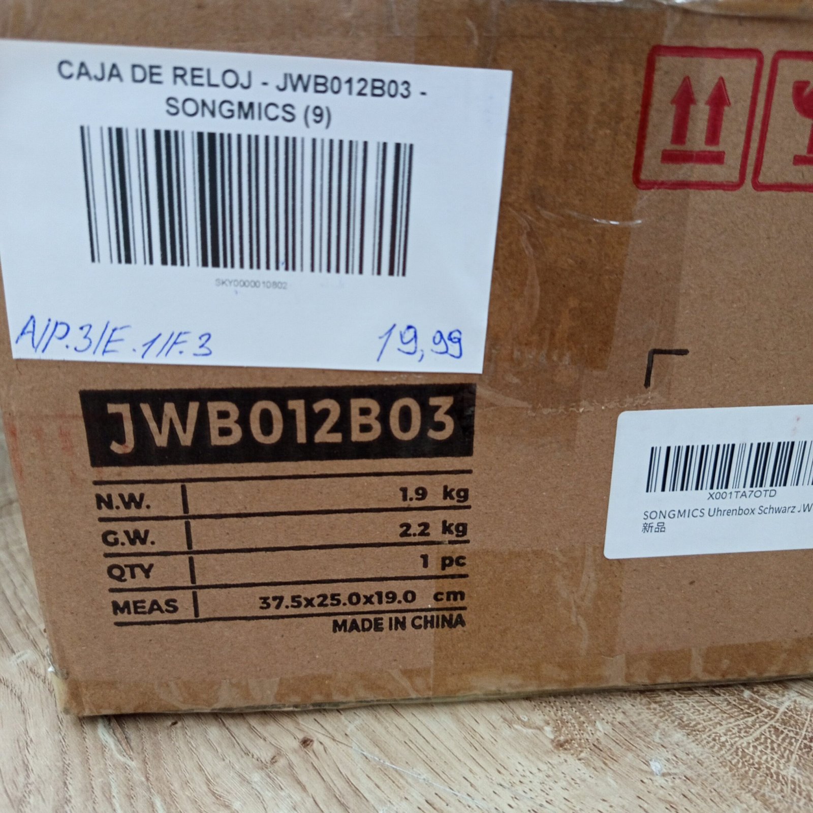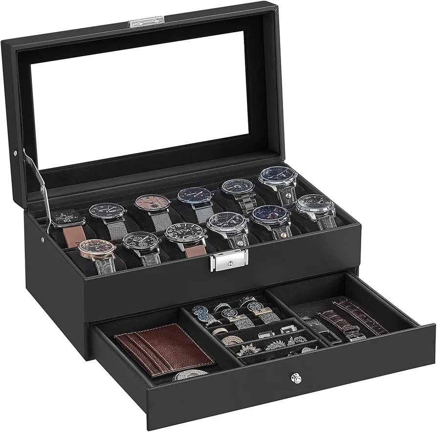 SONGMICS Caja de Reloj, Estuche de Reloj con Tapa de Cristal de 2 Niveles para 12 Relojes, Cerradura, 1 Cajón, para Anillos Pulseras, Regalo Ideal, Cuero Sintético Negro y Forro Negro JWB012B03