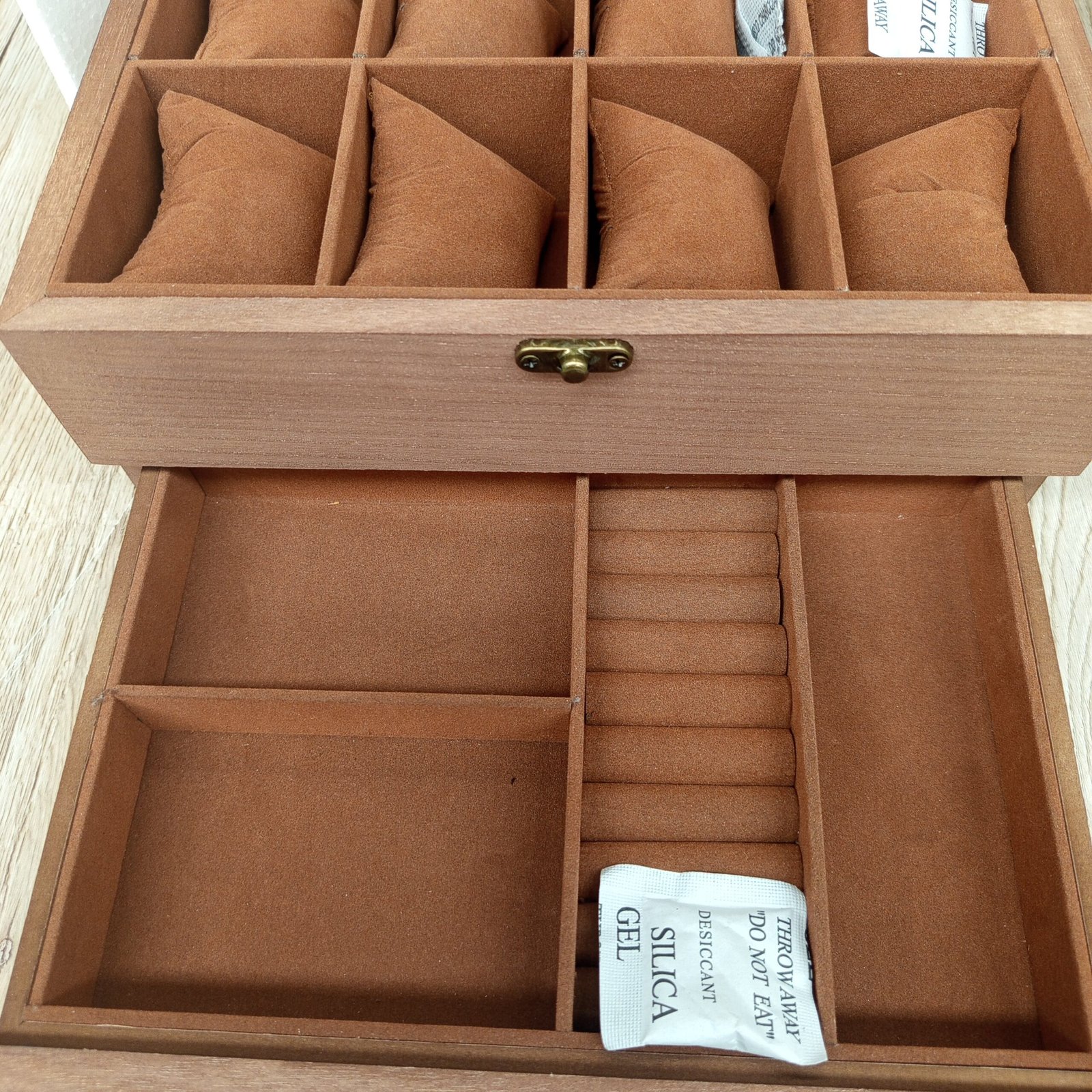Hecha del marco de madera sólido en el exterior y el terciopelo suave en el interior, este estuche protege tus relojes de arañazos. Las almohadillas blandas las mantienen en su sitio para evitar que se dañen