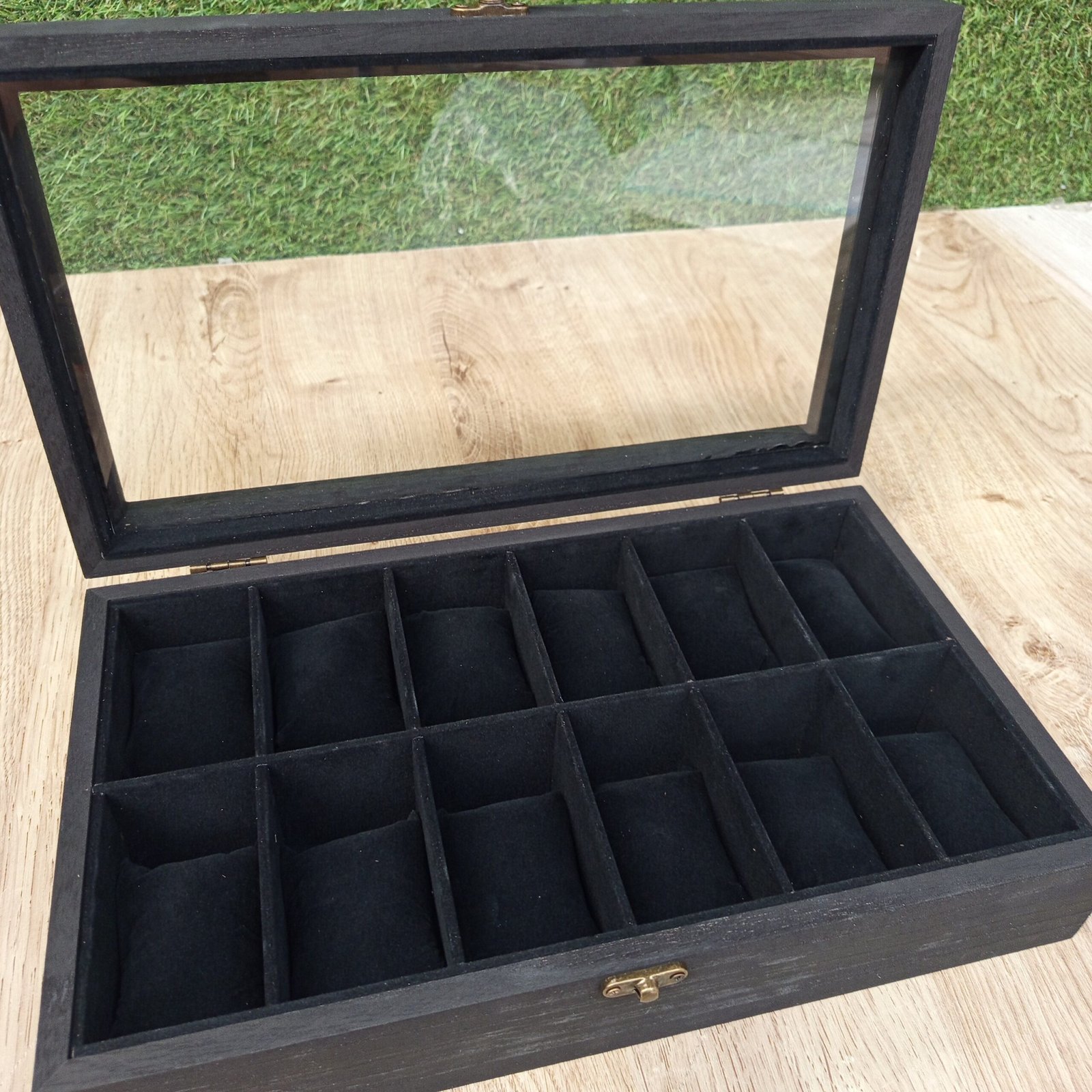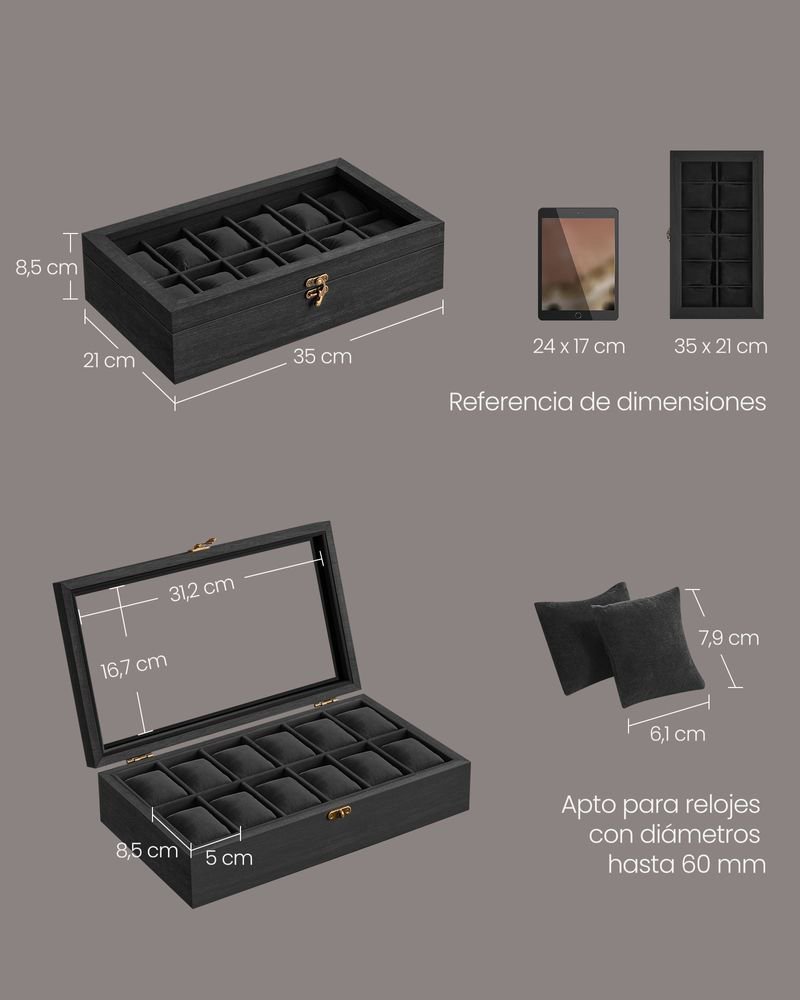 Con 12 compartimentos, esta caja para relojes permite guardar tus relojes con una esfera de hasta 51 mm en un solo lugar, para que puedas encontrar rápidamente el reloj adecuado que combina con el atuendo elegido