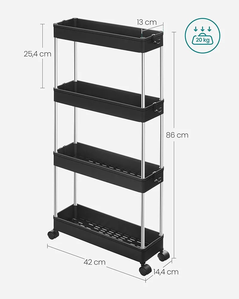 SONGMICS Carro de Almacenamiento de 4 Niveles, Carrito con Ruedas, Carro de Cocina, Ahorro de Espacio, para Baño, Oficina, 14,4 x 42 x 86 cm, Negro Tinta KSC008B01