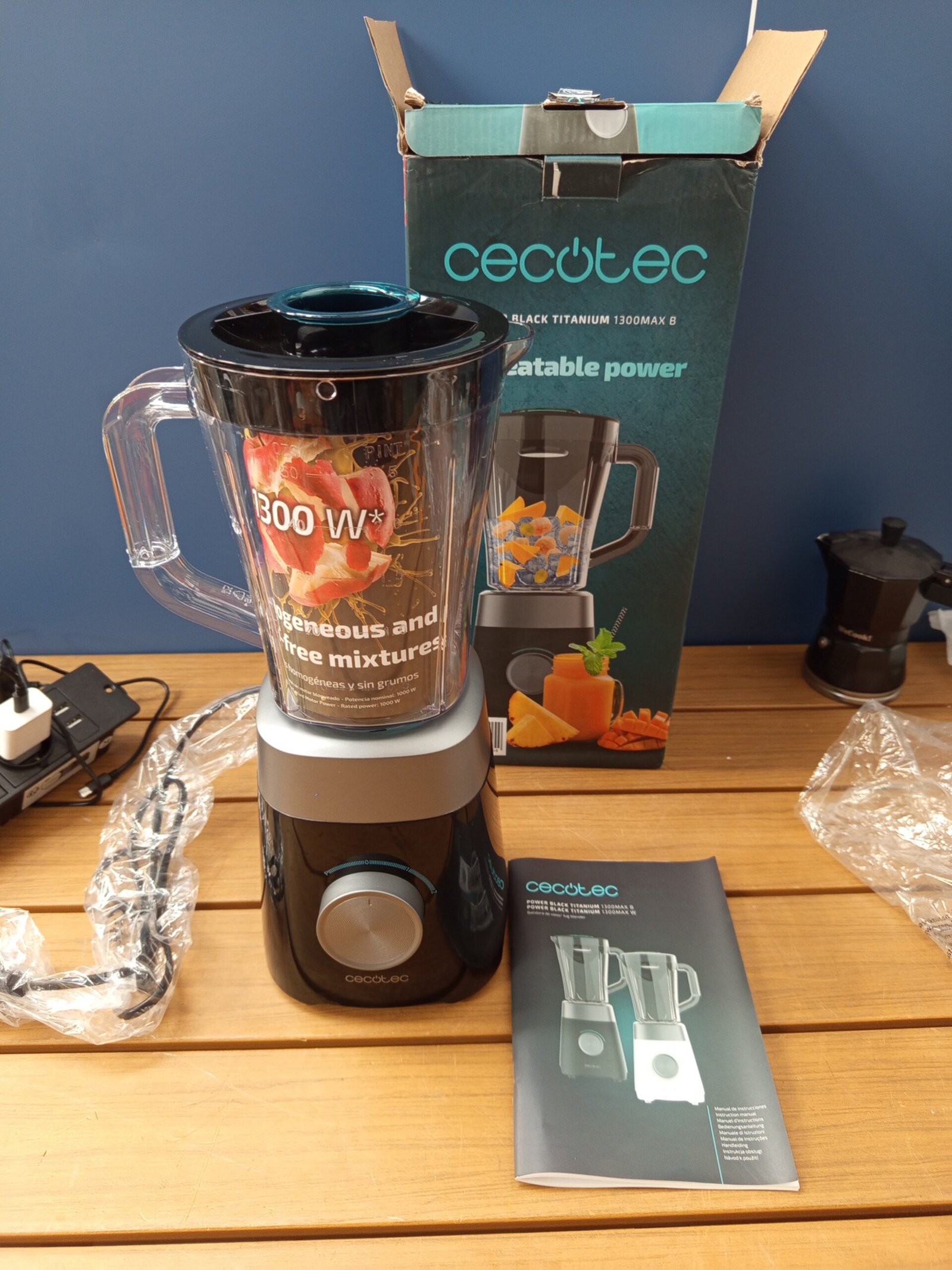 Cecotec Batidora de Vaso Power Black Titanium 1300Max B. 1300 W, 2 Velocidades, Cuchilla de 4 Hojas de Titanio Negro y Jarra de 1,5 L de Capacidad, Función Pulse Tritura y Pulveriza, Picahielo 1300 W de potencia máxima: consigue triturados perfectos con sus 20000 rpm de velocidad.