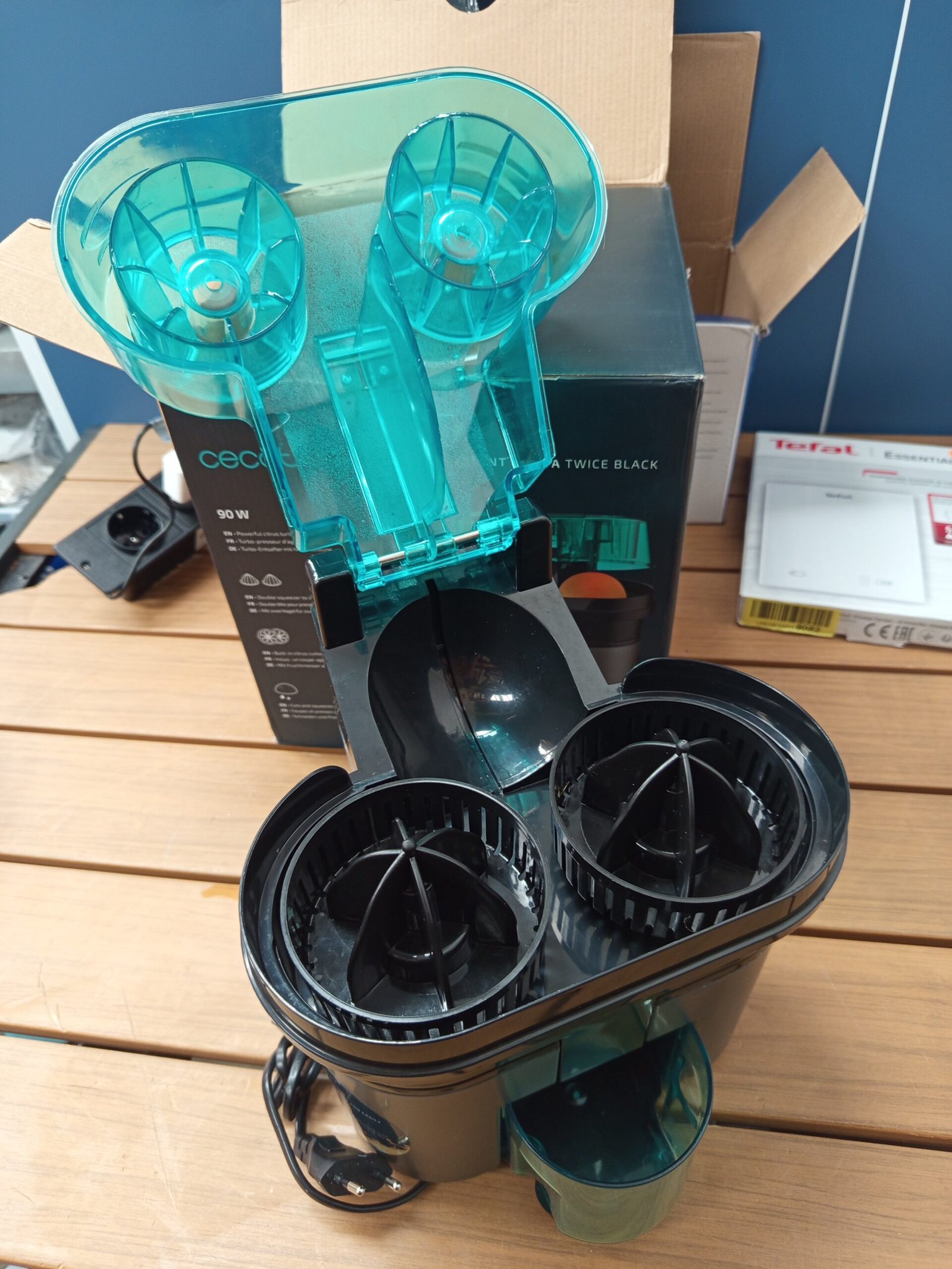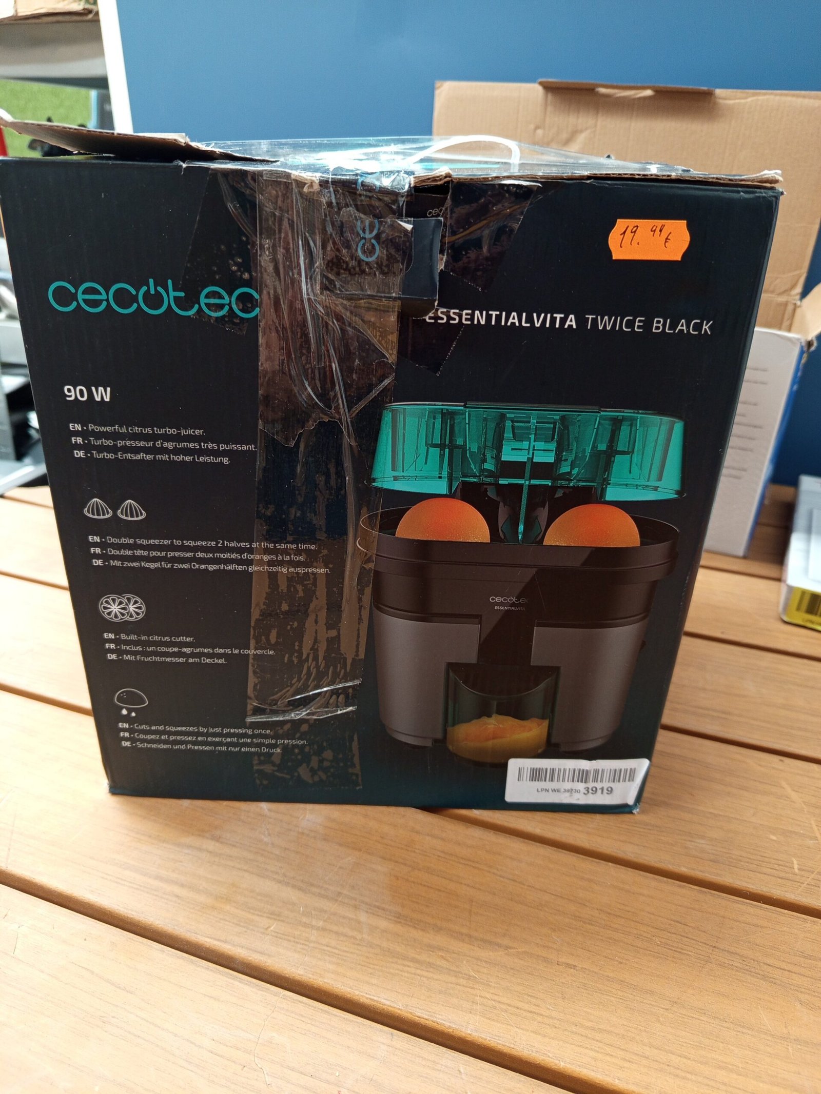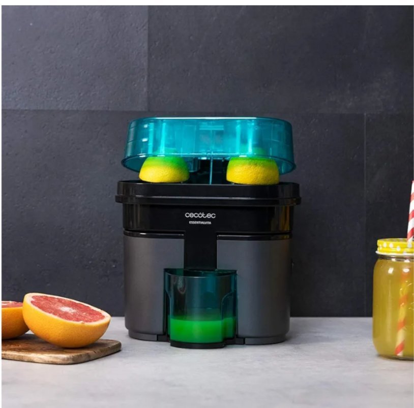 - Cecotec Exprimidor Naranjas eléctrico EssentialVita Twice Black. 90 W, Doble Cabezal y Cortador, Filtro para Pulpa, Vaso 500ml, Piezas aptas para lavavajillas Turboexprimidor de naranjas con 90 W de potencia. Doble cabezal para exprimir dos mitades de naranja a la vez.Incluye un cortador de cítricos en la tapa para cortar la pieza de fruta en el mismo exprimidor. Corte y exprimido de dos mitades de naranja con un solo aplique de presión.
