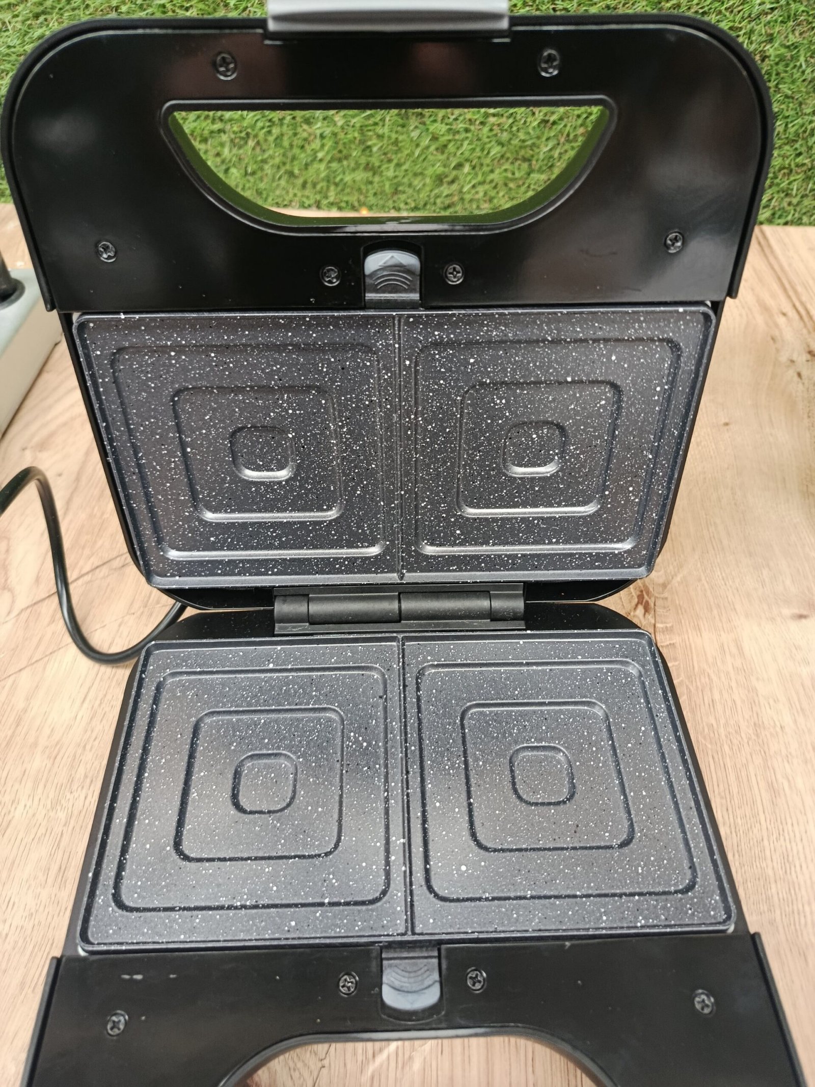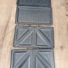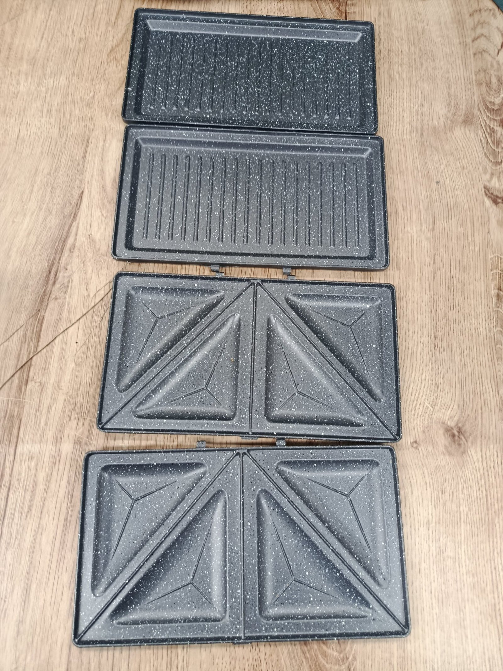 Sandwichera 3 en 1 que incluye 3 placas desmontables e intercambiables: sándwiches triangulares, cuadrados y grill para cocinar todo tipo de alimentos.