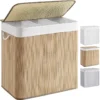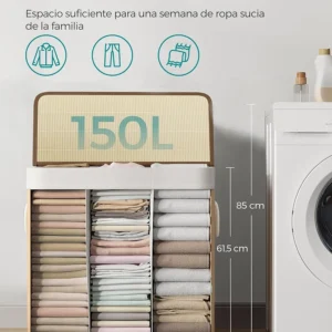 SONGMICS – Cesta de lavandería (150 L, 3 compartimentos de clasificación, tapa de bambú, asas, plegable, bolsa extraíble lavable a máquina, para lavandería, dormitorio, color madera LCB091N01