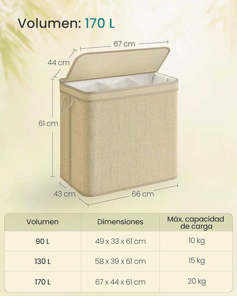 Mucho espacio de almacenamiento con 3 compartimentos: Con dimensiones de 67 x 44 x 61 cm, este cesto de 170 L ofrece espacio suficiente para la colada de una semana de 3 personas. Los 3 compartimentos cabe la colada por colores (oscuro, claro, brillante)