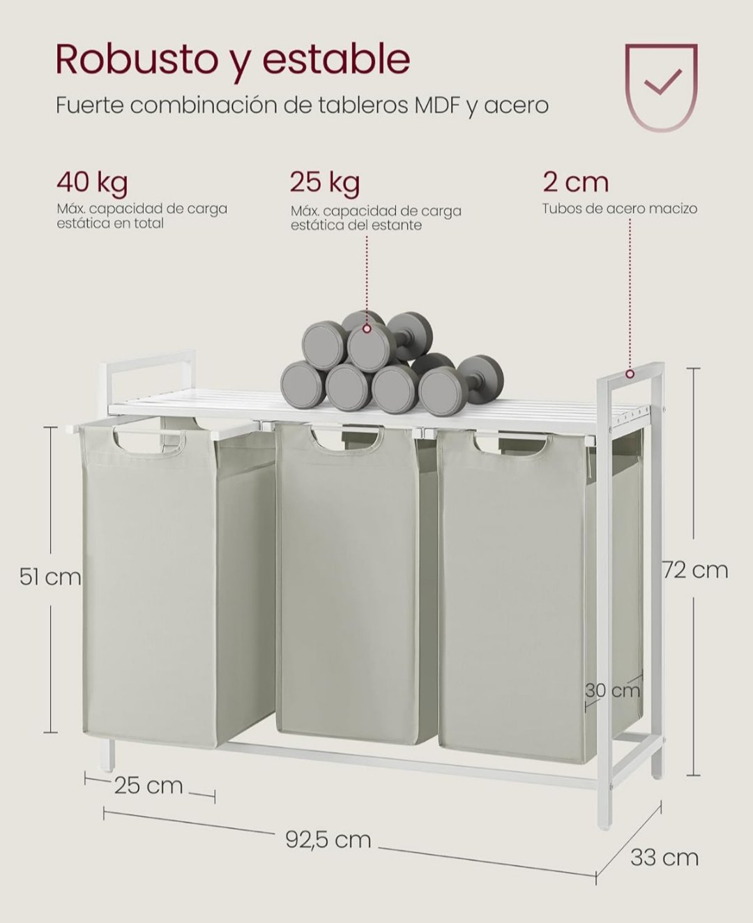 3 compartimentos: Este cesto ofrece 120 L (40 L para cada bolsa); el diseño de 3 compartimentos le ayuda a organizar la ropa por tipos o a dividir la ropa clara de la oscura