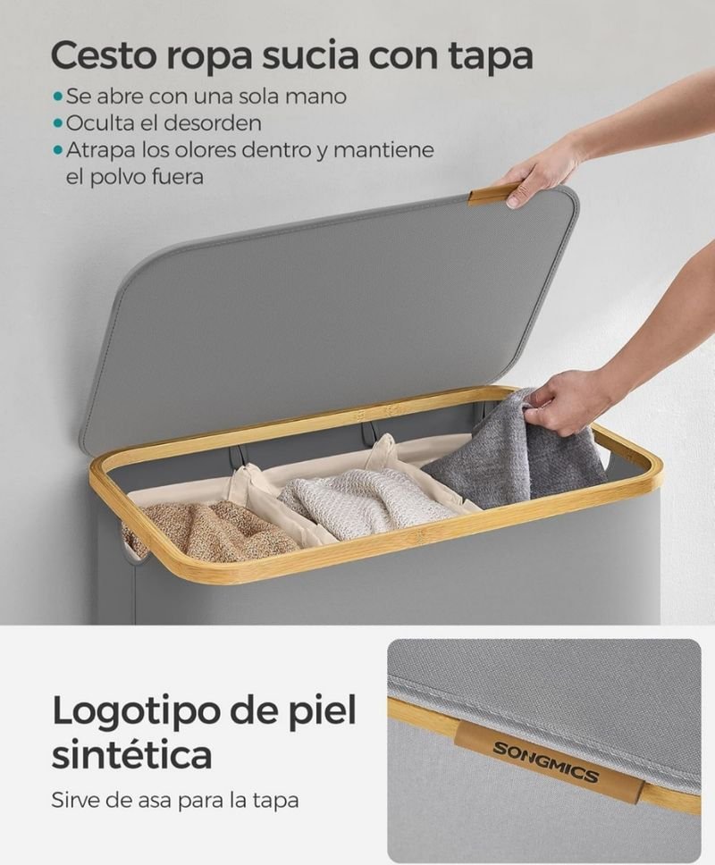 Cesto para ropa sucia SONGMICS de plástico y bambú, con tapa. Se abre con una sola mano. Ideal para ocultar olores y mantener el polvo fuera. Incluye dos bolsas de tela para la ropa. El cesto está en muy buen estado. – Diseño elegante y funcional. – Tapa con asa de piel sintética. – Capacidad para una gran cantidad de ropa.
