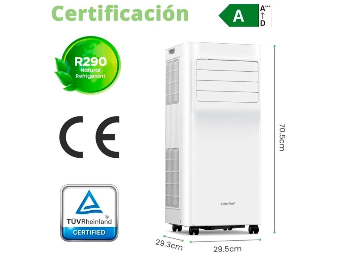 COMFEE Pingüino Aire Acondicionado Portátil 7000 BTU/1800 Frigorías Breezy Cool Pro – Climatizador sin unidad exterior, Bajo Consumo, App Control y Kit de Ventana – Refrigera, Ventila y Deshumidifica REFRIGERANTE R290 RESPETUOSO CON EL CLIMA: El uso del refrigerante R290, natural y ecológico, es una elección responsable. No agota la capa de ozono y tiene un bajo potencial de calentamiento global (GWP). Además, es eficiente y ahorra energía, contribuyendo a un estilo de vida más sostenible y consciente del medio ambiente.Dimensiones del producto29,3f. x 29,5an. x 70,5al. centímetros