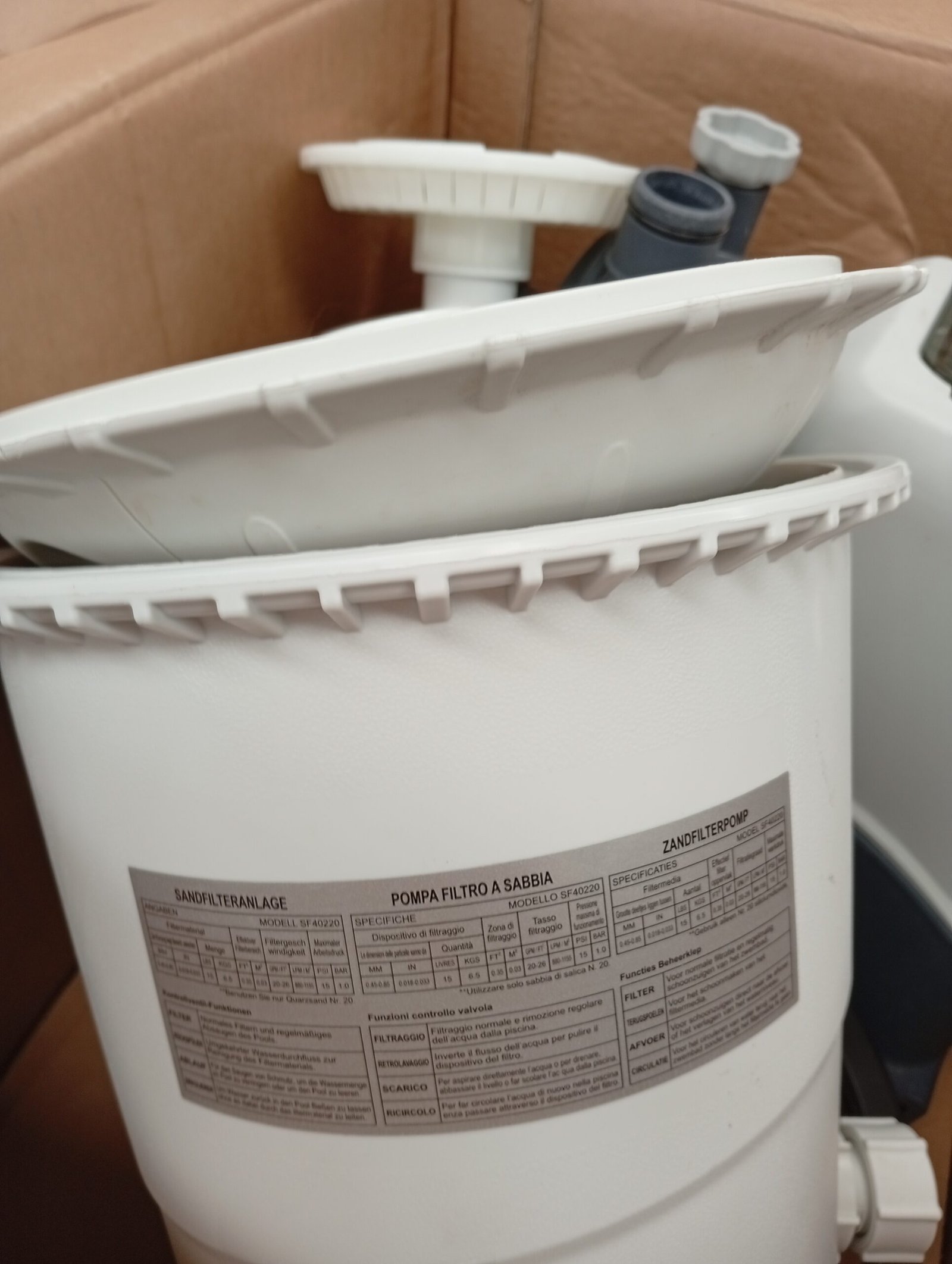 Tanque de 20,3 cm de diámetro, capacidad para 6,5 kg de arena de sílice, 5 kg de arena de vidrio N º 20 con un tamaño de partículas de 0,45 a 0,85 mm (no incluida) o 200 gramos de bolas filtrantes (no incluidas).