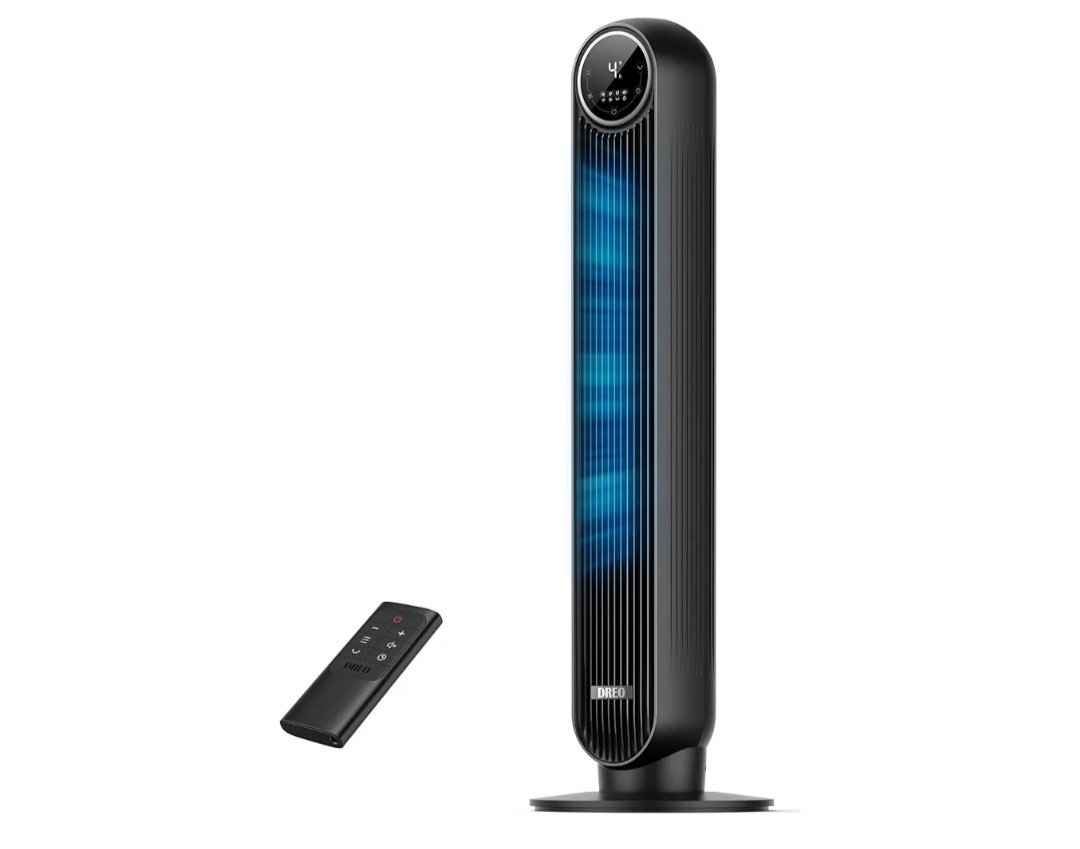 Dreo 20dB Ventilador de Pie Silencioso, Ventiladores de Torre con Velocidad de 7,6 m/s, 4 Velocidades, Rotación de 90°, Temporizador de 8 Horas, Pantalla LED y Mando a Distancia Incluido. Negro 𝐏𝐨𝐭𝐞𝐧𝐭𝐞 𝐲 𝐏𝐨𝐫𝐭á𝐭𝐢𝐥: El sistema de circulación de aire todo-en-uno de DREO se combina con un motor eléctrico de alta potencia, ofreciendo vientos refrescantes a gran velocidad. Este ventilador de torre compacto de 90 cm anima cada centímetro de aire de su espacio vital rápidamente, alcanzando hasta 7.6 m/s.