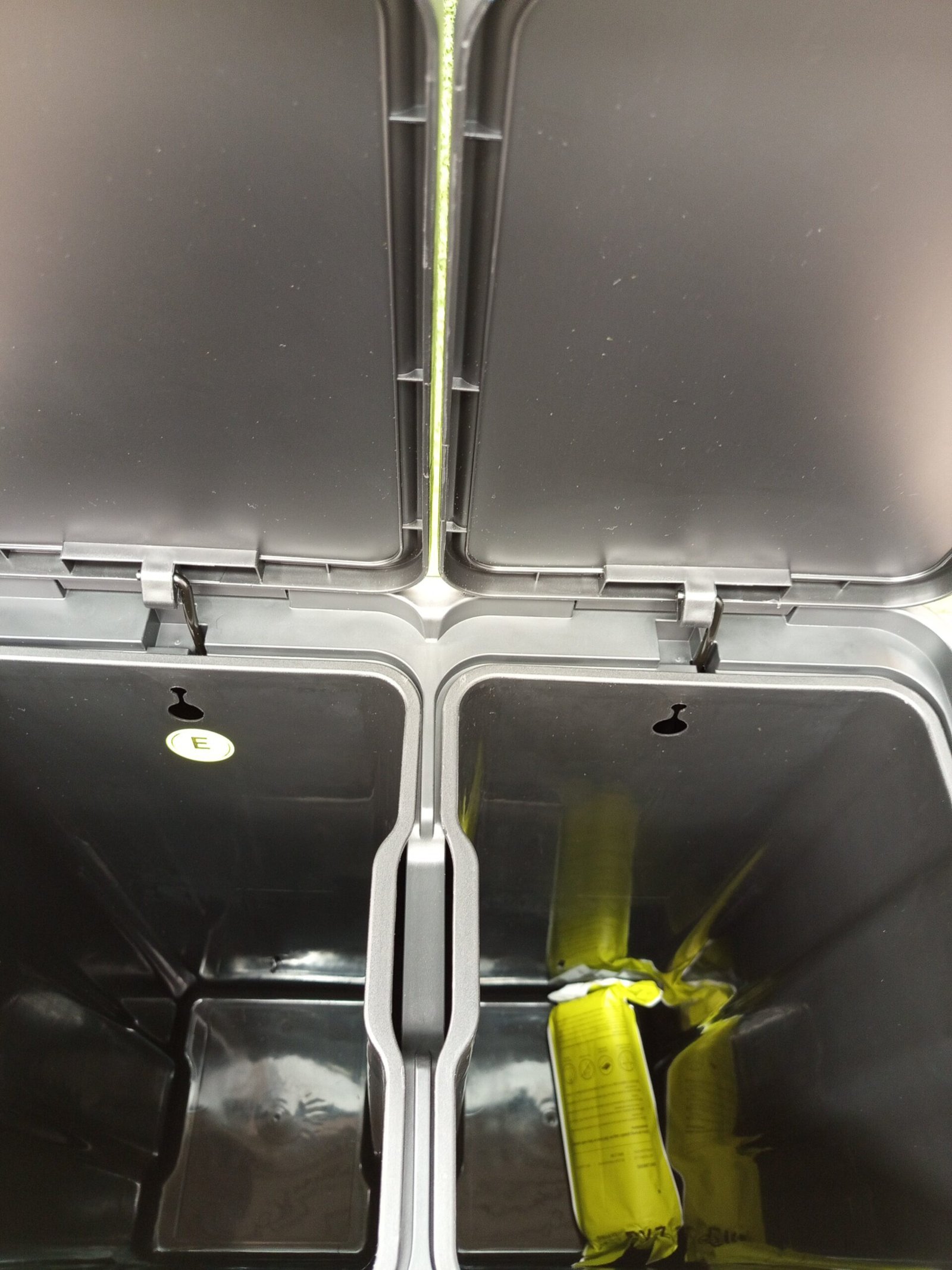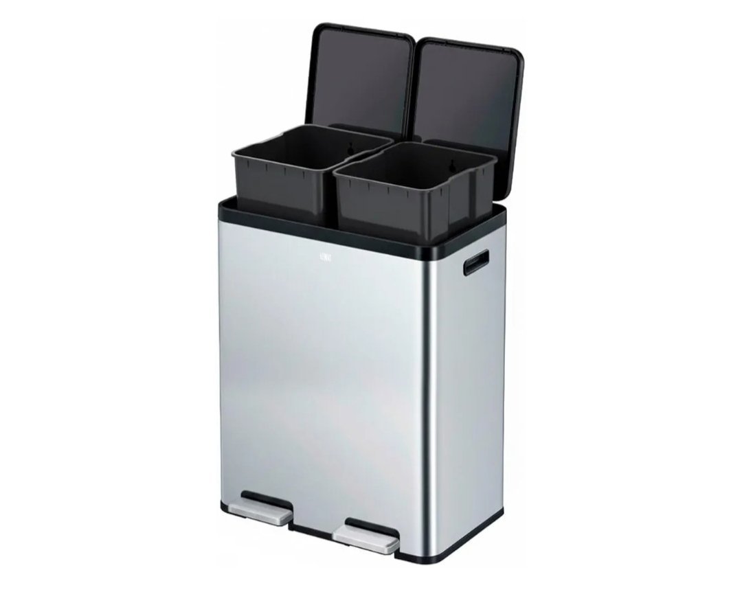 Separa residuos y reciclaje sin esfuerzo con sus dos compartimentos interiores negros y pedales diferenciados. La solución perfecta para un cubo de basura reciclaje práctico, limpio y eficiente.