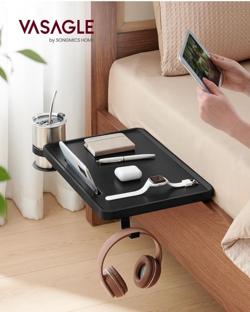 VASAGLE Estante de Cama, Mesita de Noche Colgante para litera, Cama Alta, Ranura para Teléfono Móvil, Portavasos Giratorio, Gancho, Abrazaderas Ajustables, Dormitorio, Negro Tinta LET301B01