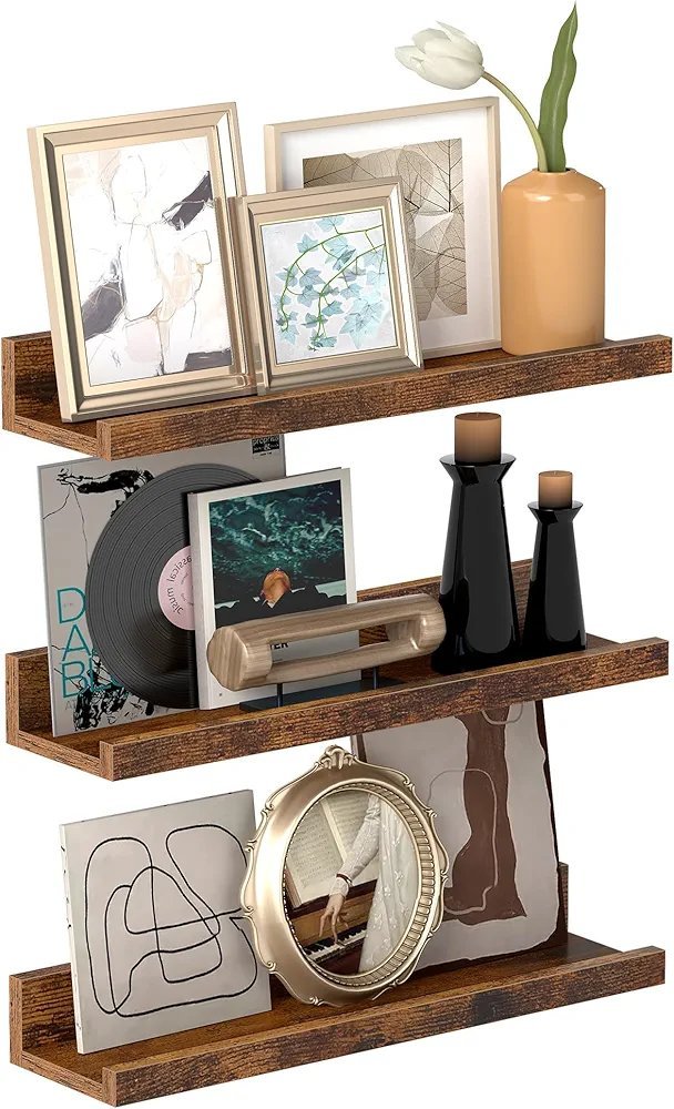 VASAGLE Estantes Colgantes de Pared, Juego de 3, Estantes Flotantes, Ancho 38 cm, con Bordes Altos, para Marcos de Fotos, Decoración, Especias, para Cocina, Sala de Estar, Marrón Rústico LWS037X01
