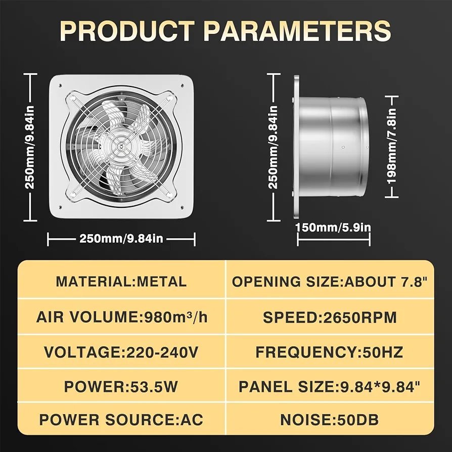 【Especificaciones Técnicas】 Diámetro: 200mm; Potencia: 53.5W; Voltaje: AC220~240V; Frecuencia: 50 Hz; Caudal: 980m³/h; Velocidad: 2650RPM.