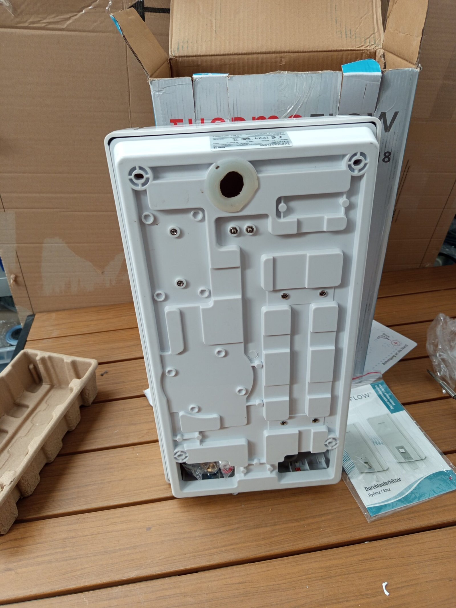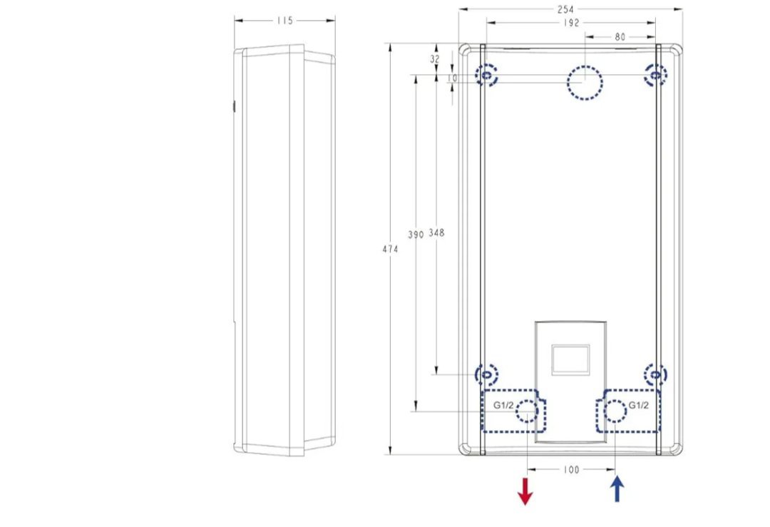 MONTAJE: El calentador de agua Thermoflow con conexiones G 1/2» puede montarse en la pared. Con dimensiones de 47,2 (alto) x 25,5 (ancho) x 11,5 (profundo) cm, el calentador de agua bajo encimera puede montarse ahorrando espacio.