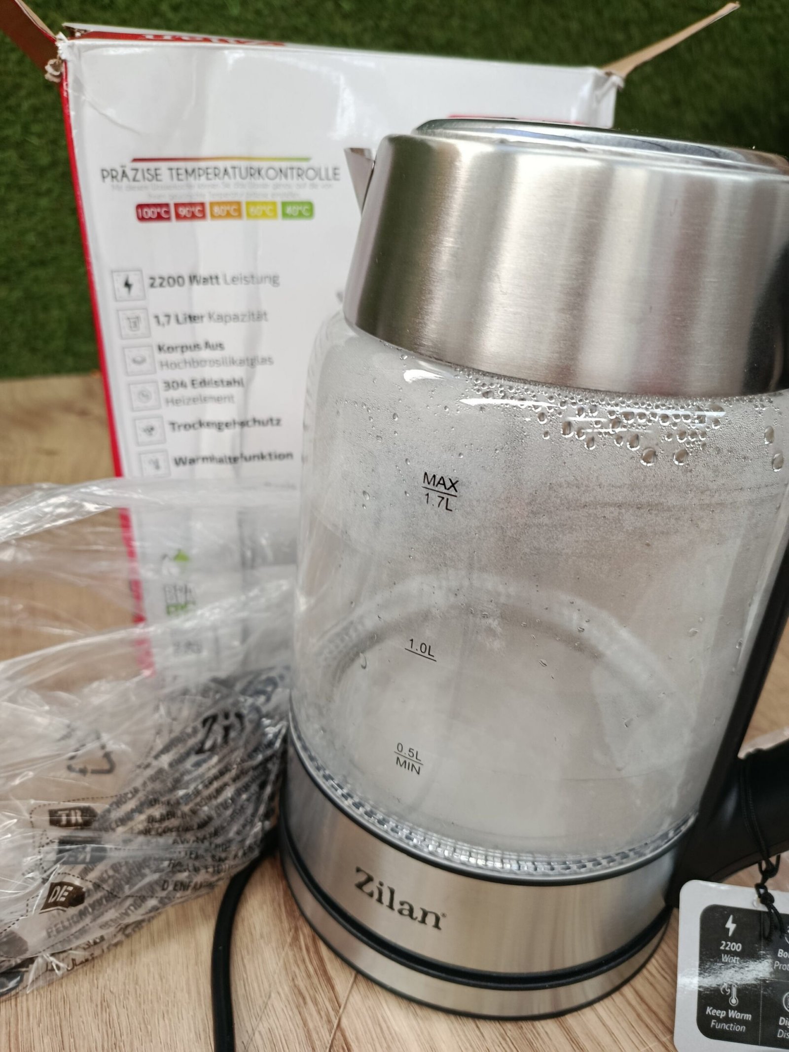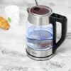 Capacidad: 1,7 litros Base giratoria de 360°, fácil de usar Con cuerpo de alto vidrio de borosilicato Duradero y resistente a las manchas Elemento calefactor oculto de acero inoxidable 304