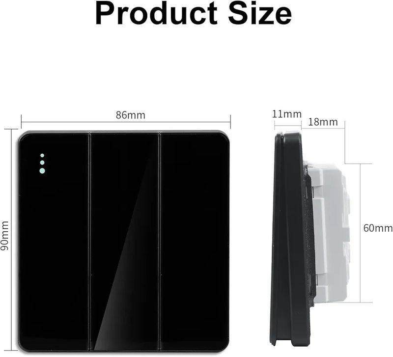 El interruptor de presión está diseñado para funcionar a cargas inductivas de 16 AX. Profundidad de la caja de montaje de 21 mm, placa de pared a presión sin tornillos. 250 V CA, 86 mm x 90 mm