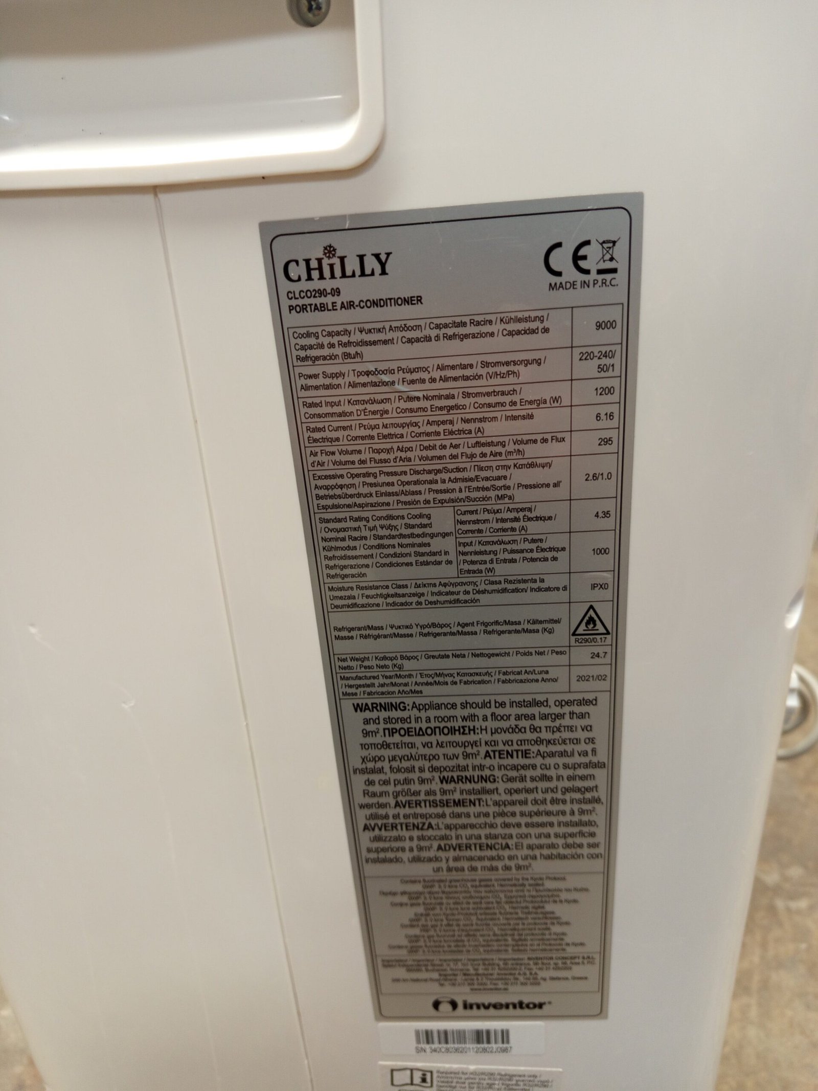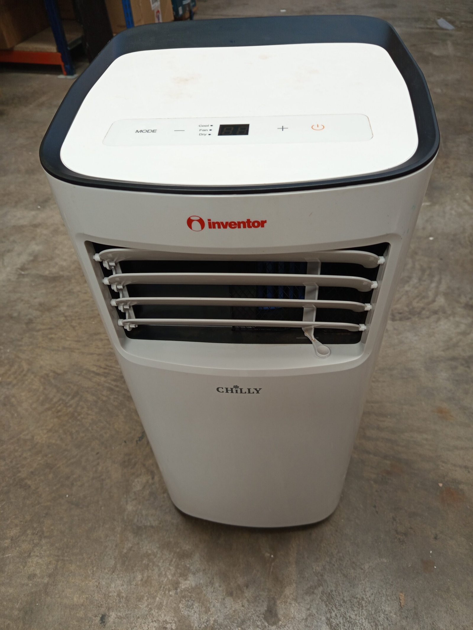 Inventor Chilly 9000BTU Acondicionador de aire portátil 3-1 Inventor Chilly, Aire Acondicionado Portátil R290 de 2270 frigorías – 9000BTU/h, 3 modos en 1 (Refrigeración, Deshumidificación, Ventilación) (RAEE N° ES6988)Dimensiones del producto 38f. x 34,5an. x 72,3al. centímetros