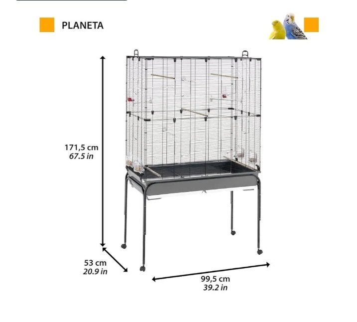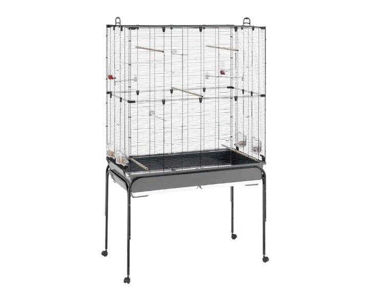 Ferplast Espaciosa jaula para canarios, periquitos y pájaros exóticos PLANETA, con accesorios y soporte con ruedas con repisa portaobjetos, alambre pintado negro y cubeta marrón, 97 x 58 x h 173,5 cm