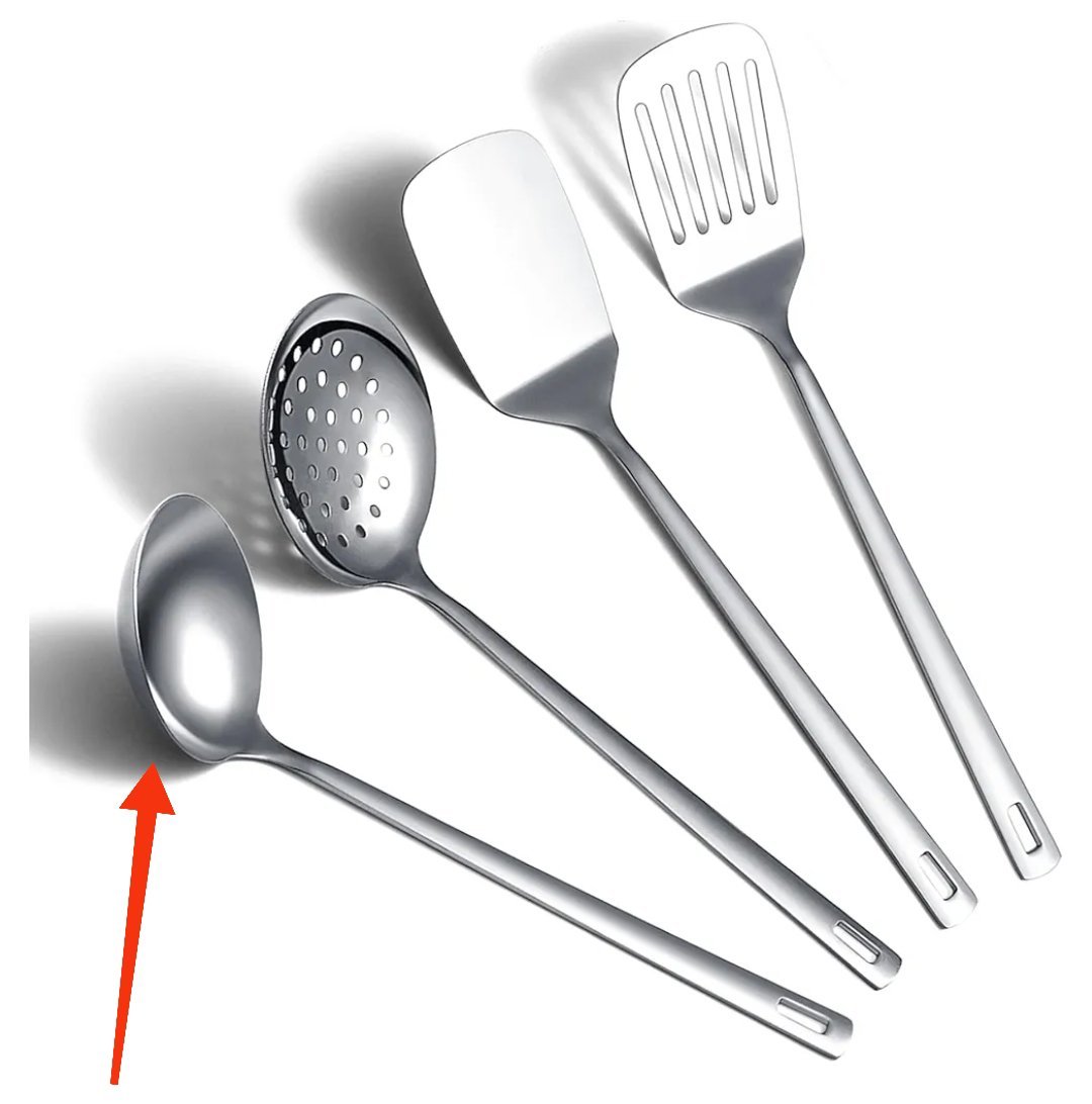 Juego de utensilios de cocina de acero inoxidable de 4 piezas que incluye juego de espátula de metal, espumadera de cocina, cucharón de sopa, elementos esenciales de cocina