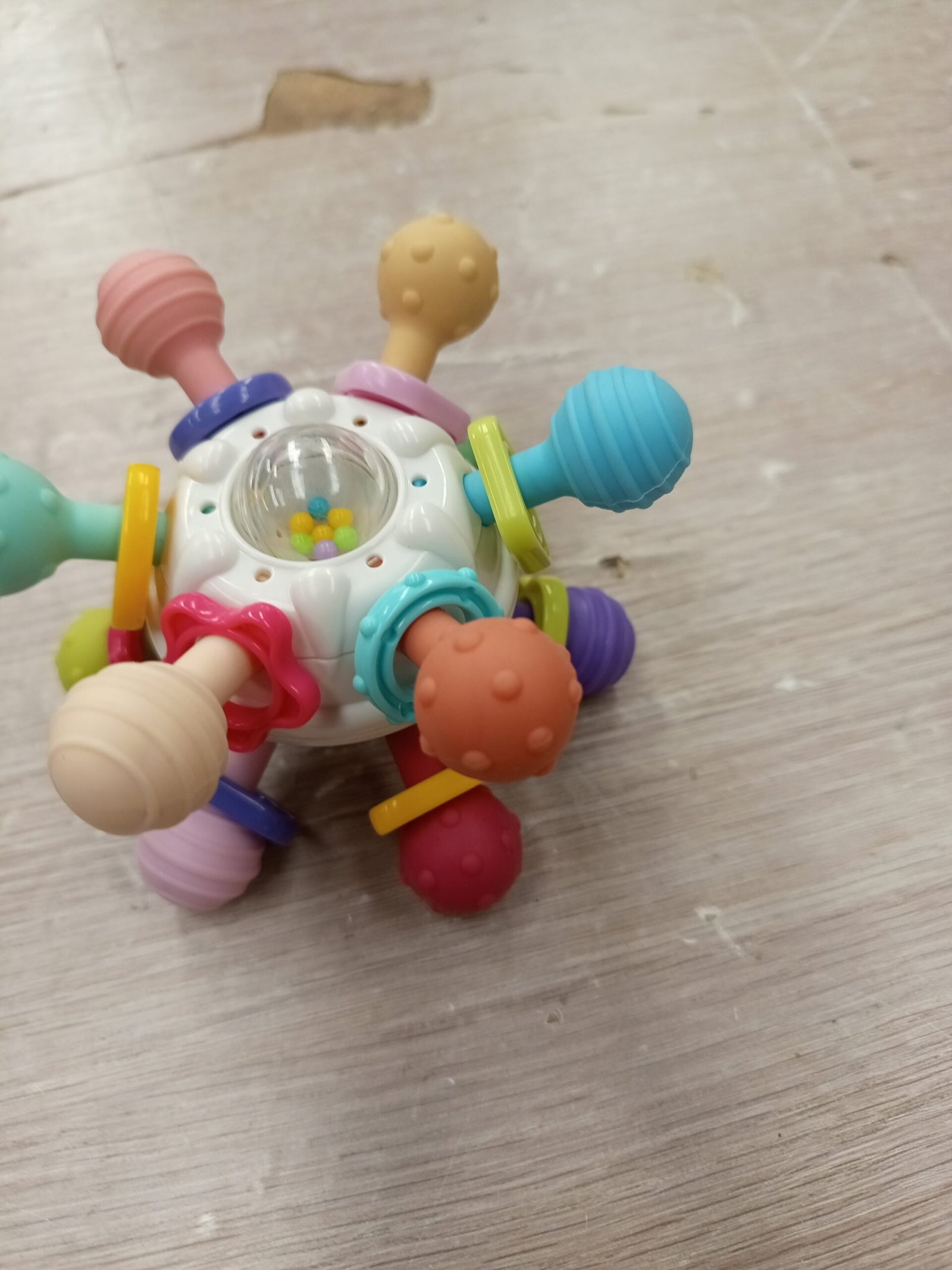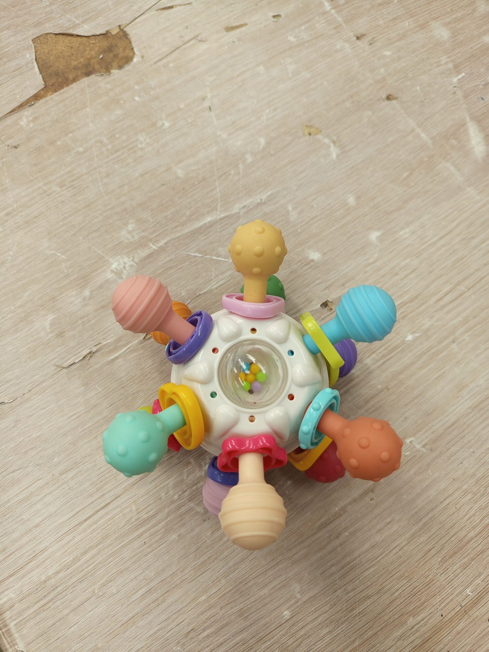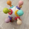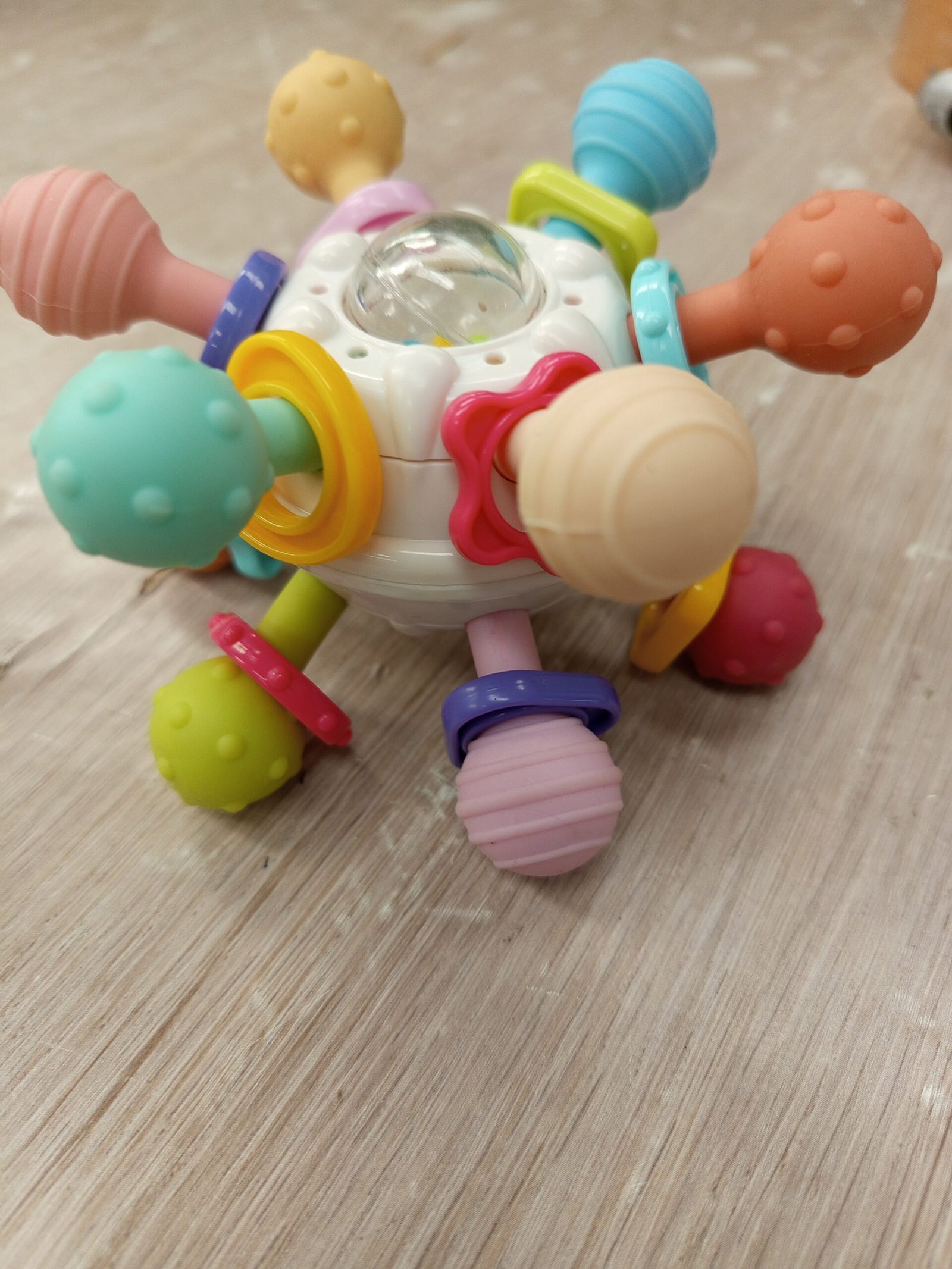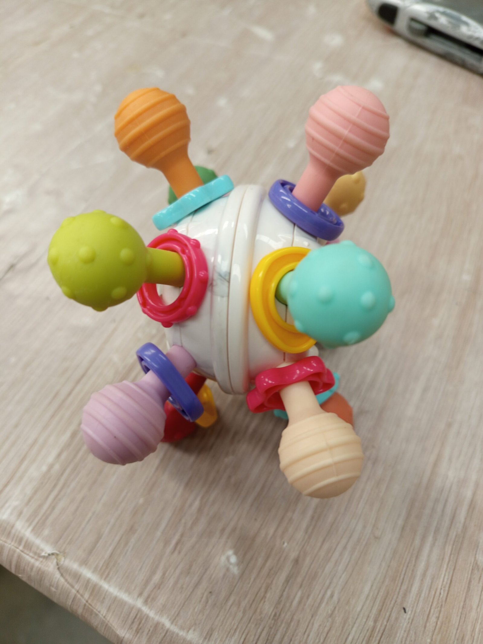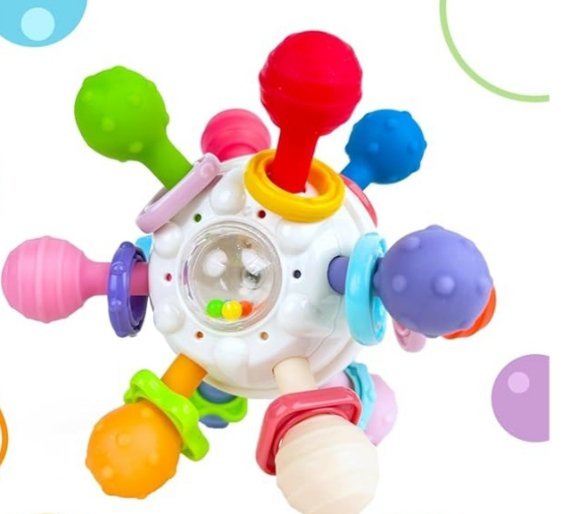 Está fabricado de silicona de grado alimenticio y ABS con 12 puntos suaves de masticación y 2 superficies de diferentes texturas, que sirven para aliviar el dolor de dentición de los bebés en la etapa oral. También ejercita los movimientos de masticación y mordida del bebé.