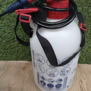 Pulverizador a presión con acción de bomba de 5 litros (1.3 galones) con válvula de liberación de presión y correa para el hombro.