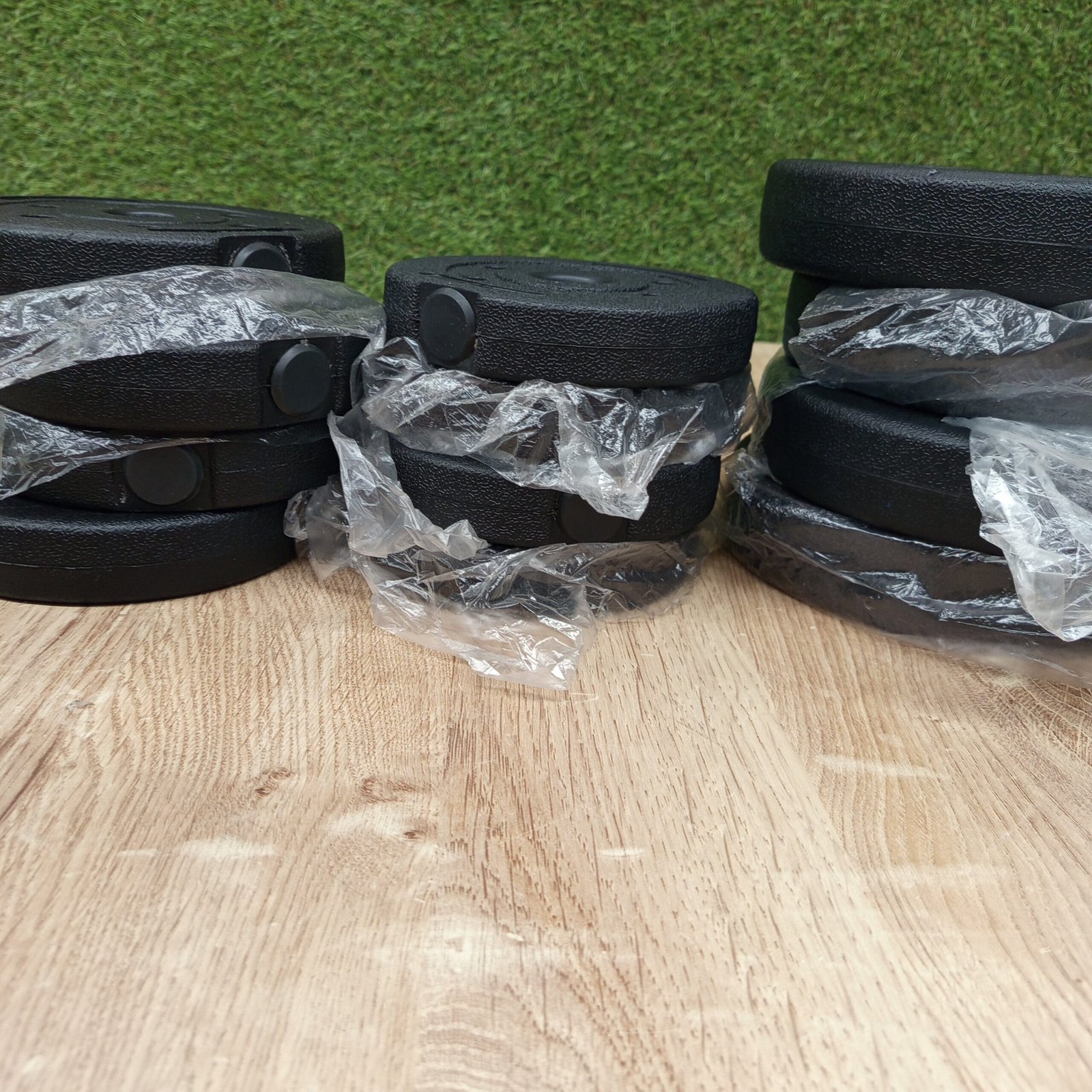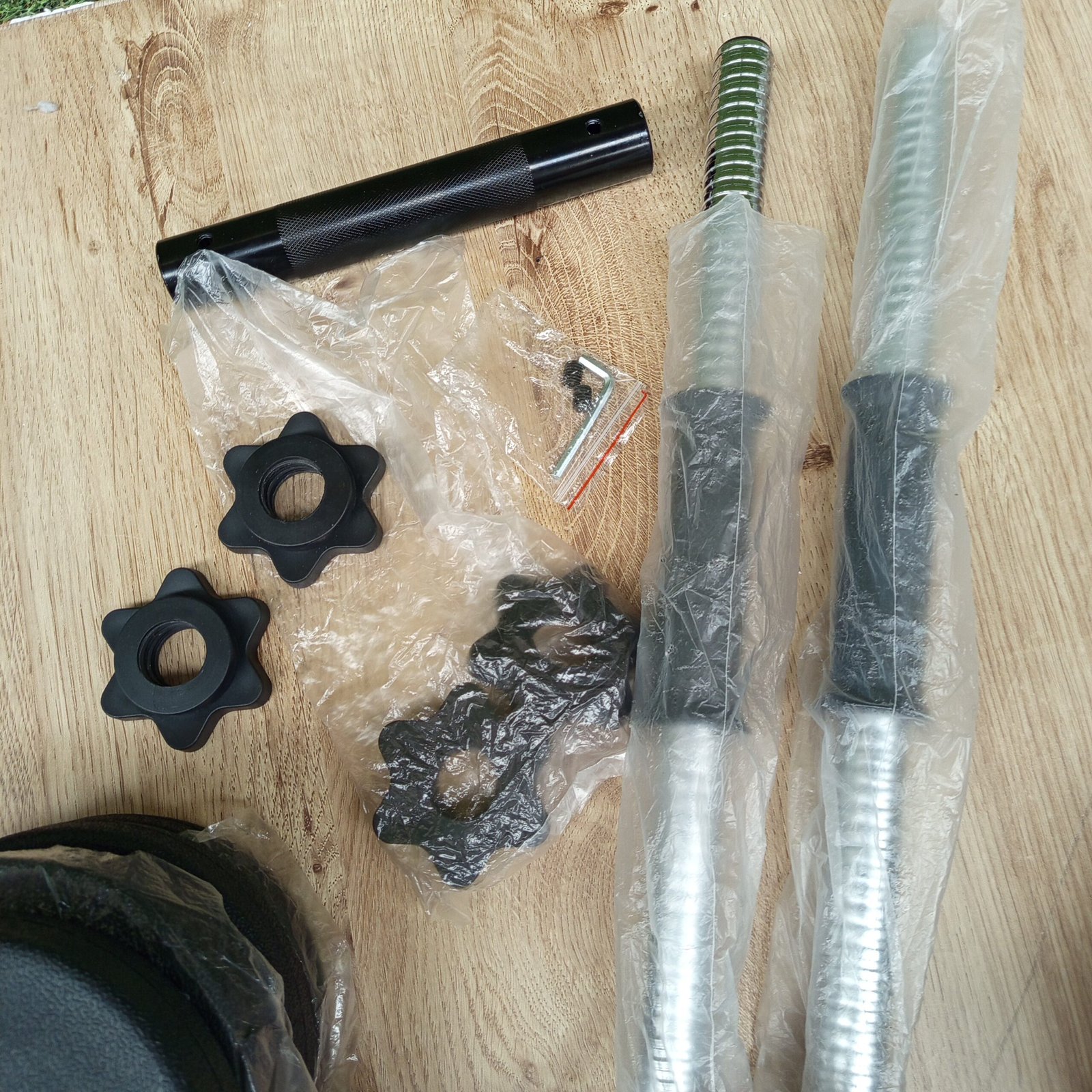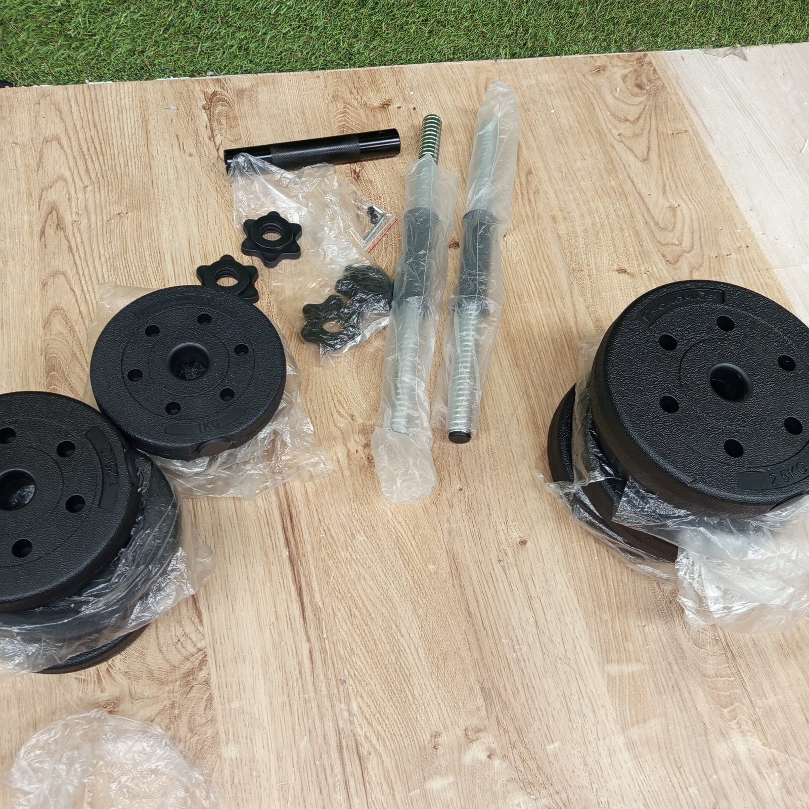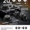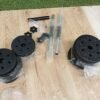 20 kg, incluidos 4 placas de 2,5 kg, 4 placas de 1,25 kg, 4 placas de 1 kg, 2 barras de mancuernas, 4 collares en forma de estrella y una barra de extensión que permite colocar 2 mancuernas de 10 kg o una mancuerna de 20 kg