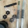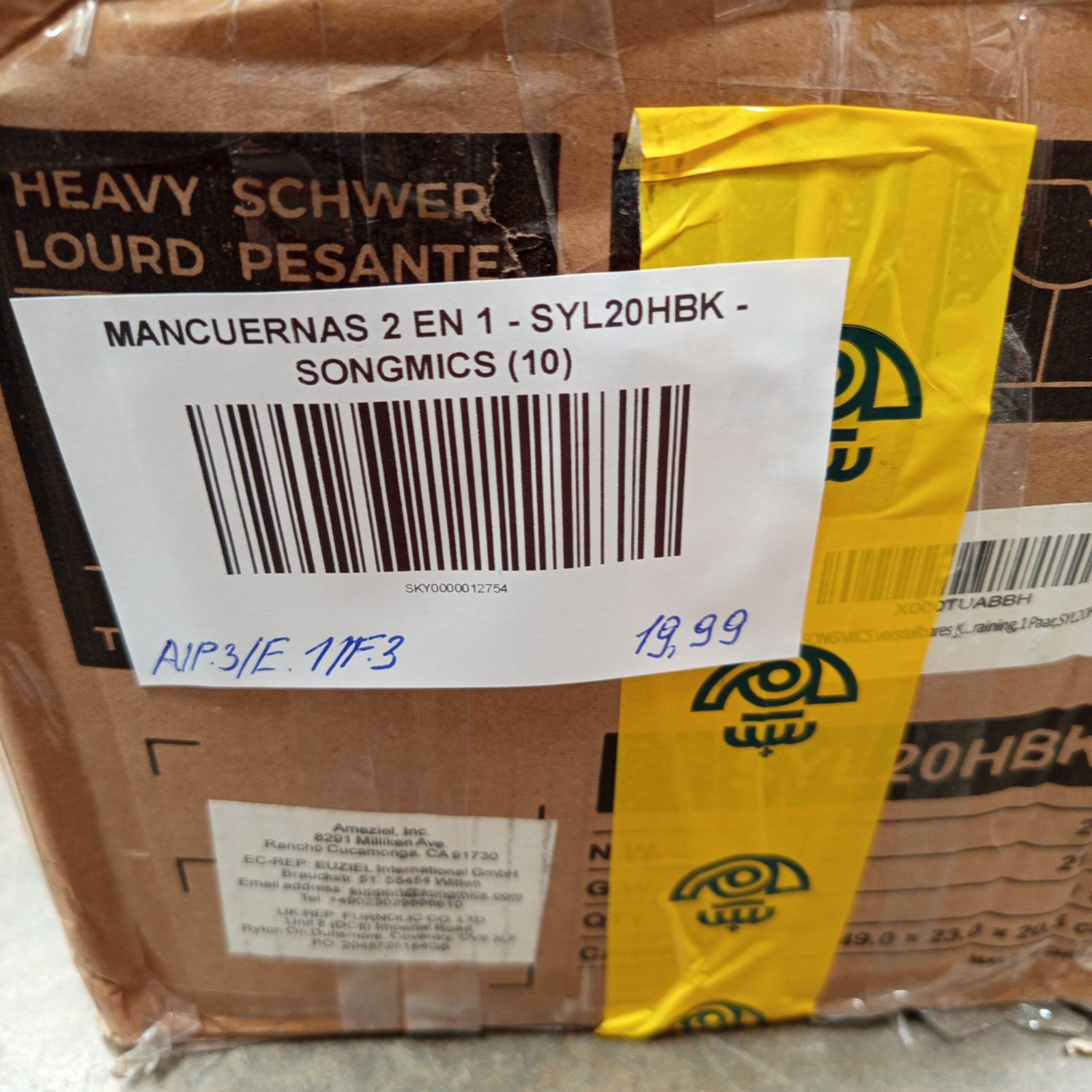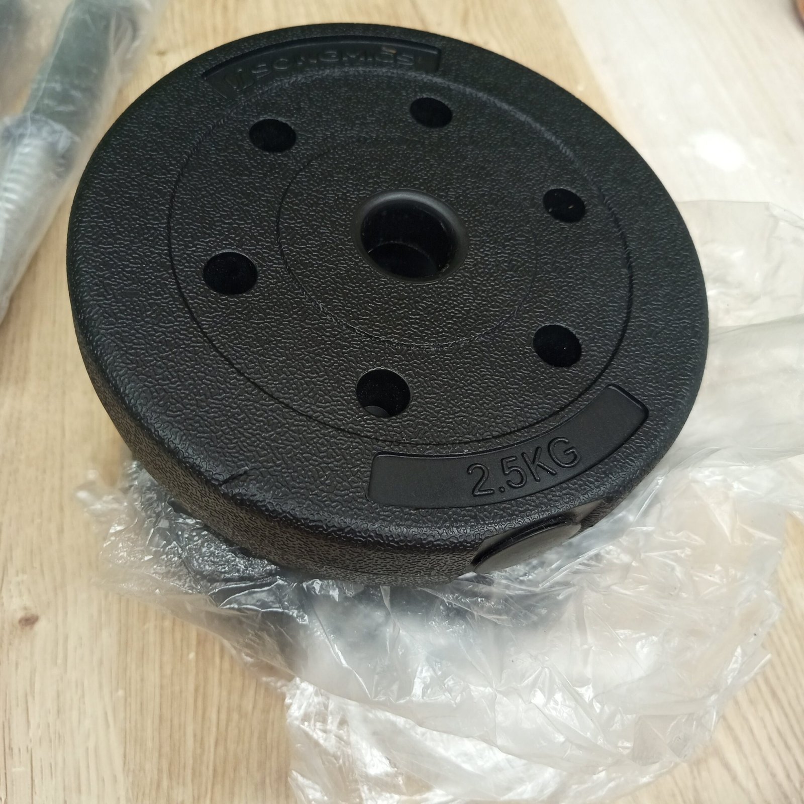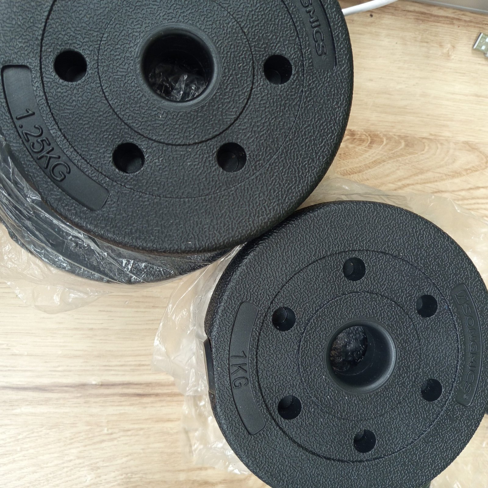 20 kg, incluidos 4 placas de 2,5 kg, 4 placas de 1,25 kg, 4 placas de 1 kg, 2 barras de mancuernas, 4 collares en forma de estrella y una barra de extensión que permite colocar 2 mancuernas de 10 kg o una mancuerna de 20 kg