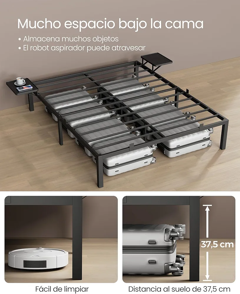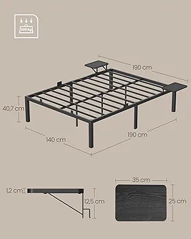 VASAGLE Marco de Cama Matrimonio, Estructura de Cama de Metal, con Estantes de Almacenamiento, Invitados, para Colchón de 140 x 190 cm, Fácil Montaje, Negro Clásico RMB093B01