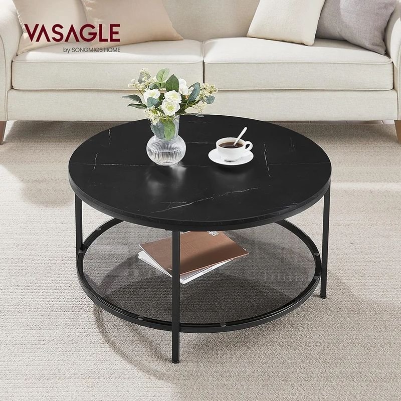 VASAGLE Mesa de Centro, Mesita de Salón, de Mármol de Imitación Redonda, Estante de Vidrio Templado, Montaje Fácil, Estilo Moderno, Blanco Mármol y Dorado Métalico LCT071B58