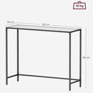 Un tablero de cristal templado de 5 mm de espesor se coloca en el marco metálico de esta mesa de consola de 35 x 100 x 80 cm, proporcionando un soporte sólido para hasta 30 kg de plantas, decoraciones, libros o marcos de fotos