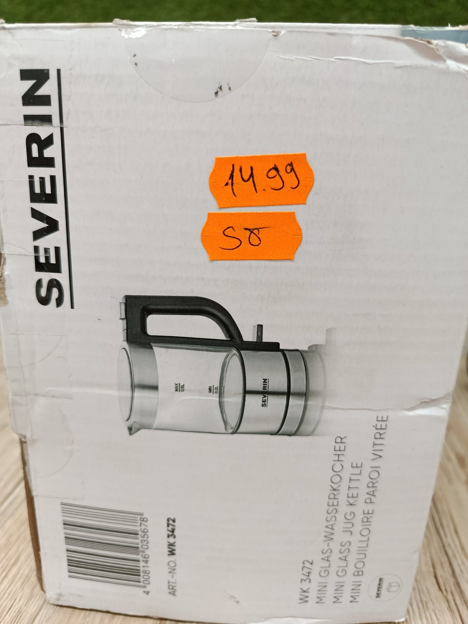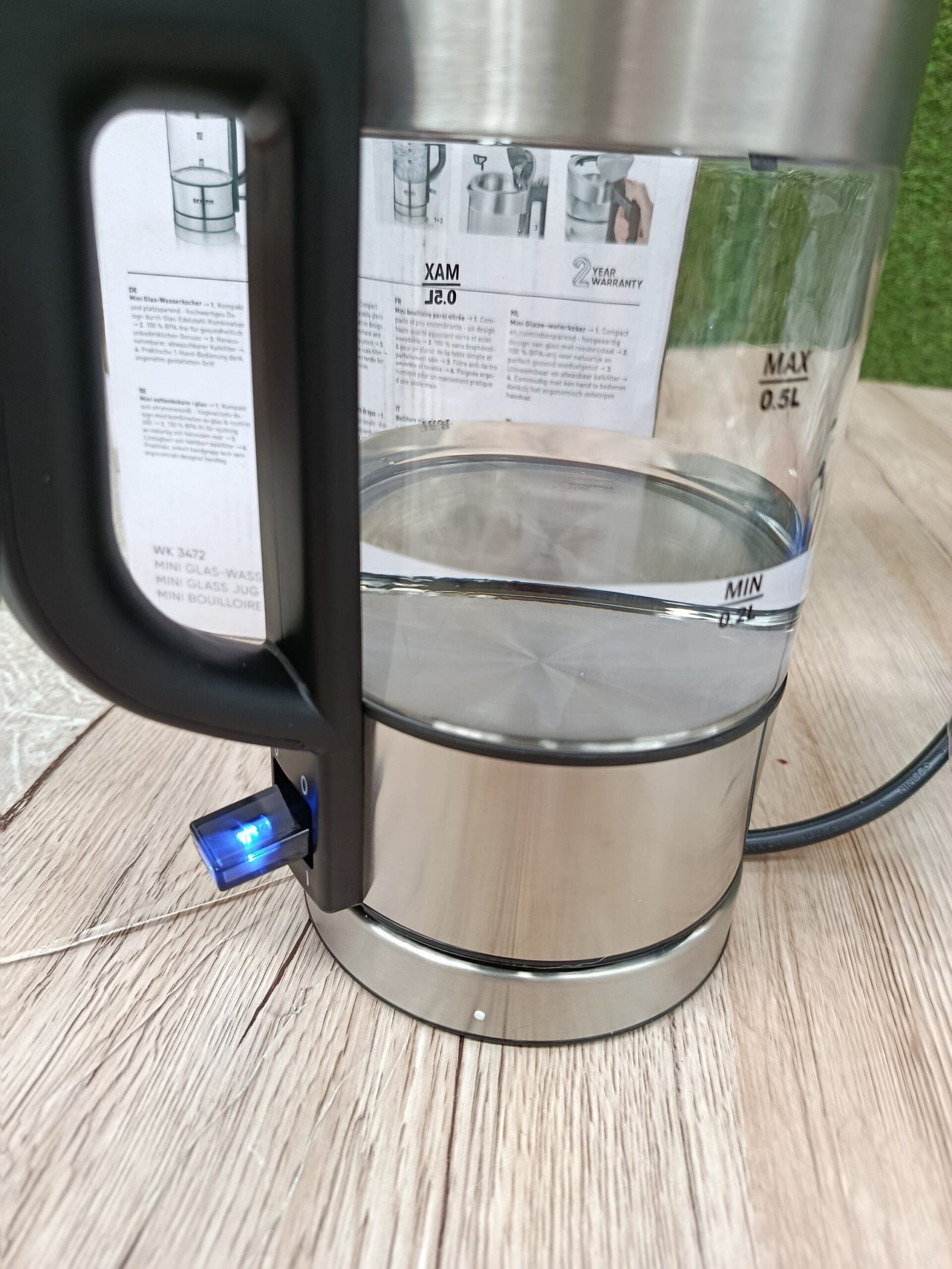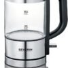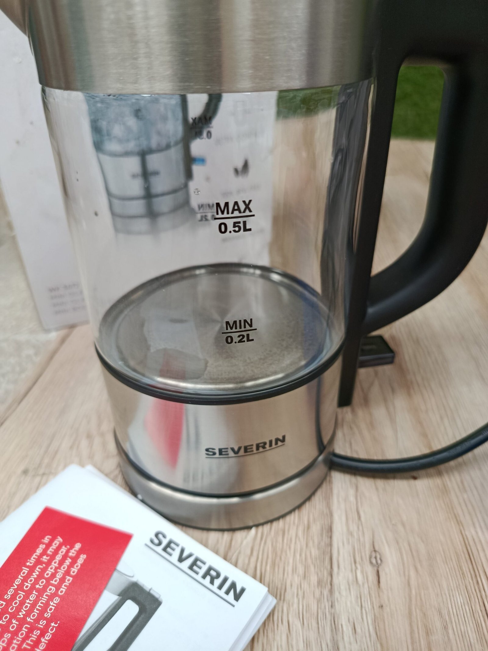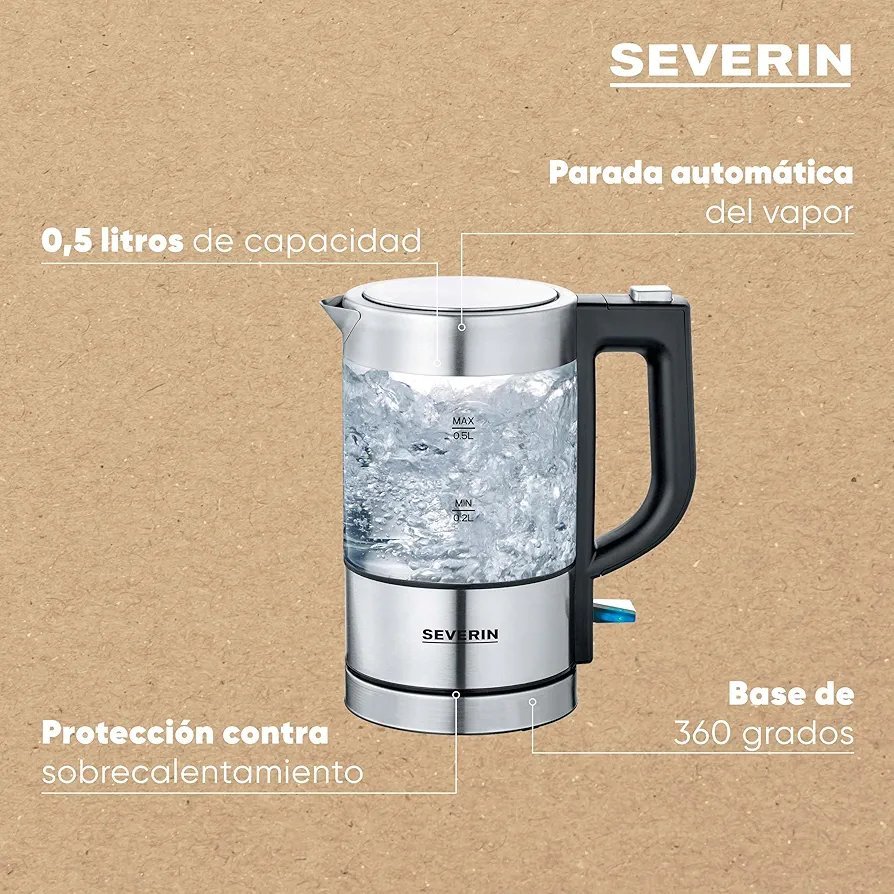 SEVERIN – Mini hervidor de agua 0,5 l, jarra eléctrica de cristal pequeña con filtro antical lavable, base de 360° giratoria y inalámbrica, libre de BPA, acero inoxidable, 1100 W, WK 3472