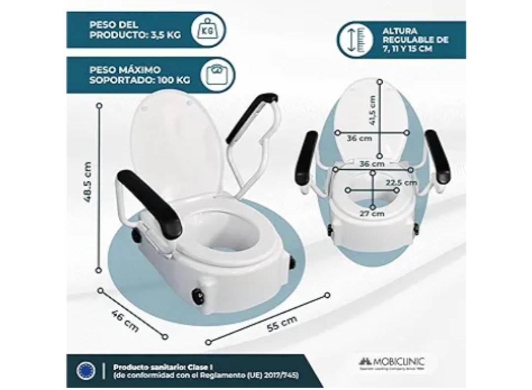 Mobiclinic®, Elevador wc para adultos con reposabrazos, Tajo, 19 cm, Ancianos, Tapa y abatibles, De inodoro, Regulable en 3 alturas, Inclinable, Blanco La fácil regulación e inclinación de sus reposabrazos abatibles y sus 19 cm de elevación lo convierten en un elevador WC para ancianos y personas con movilidad reducida muy confortable u cómodo a la hora de sentarse e incorporarse