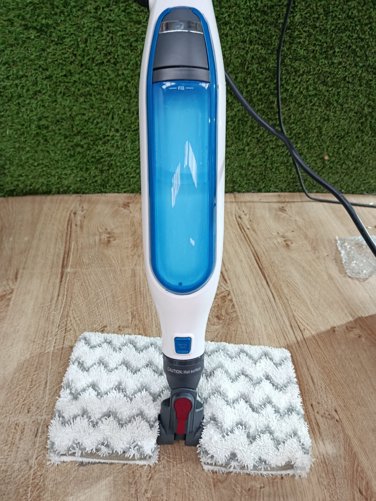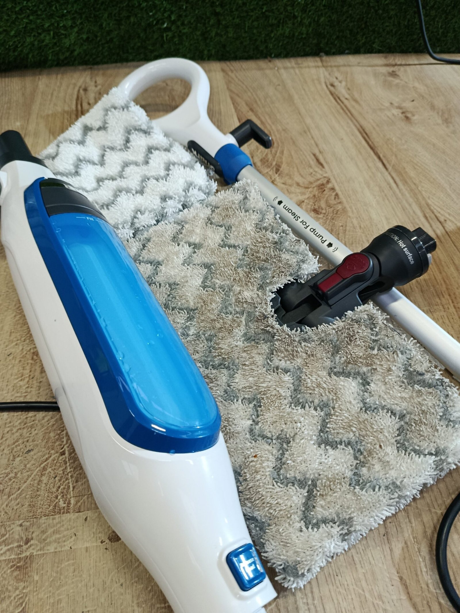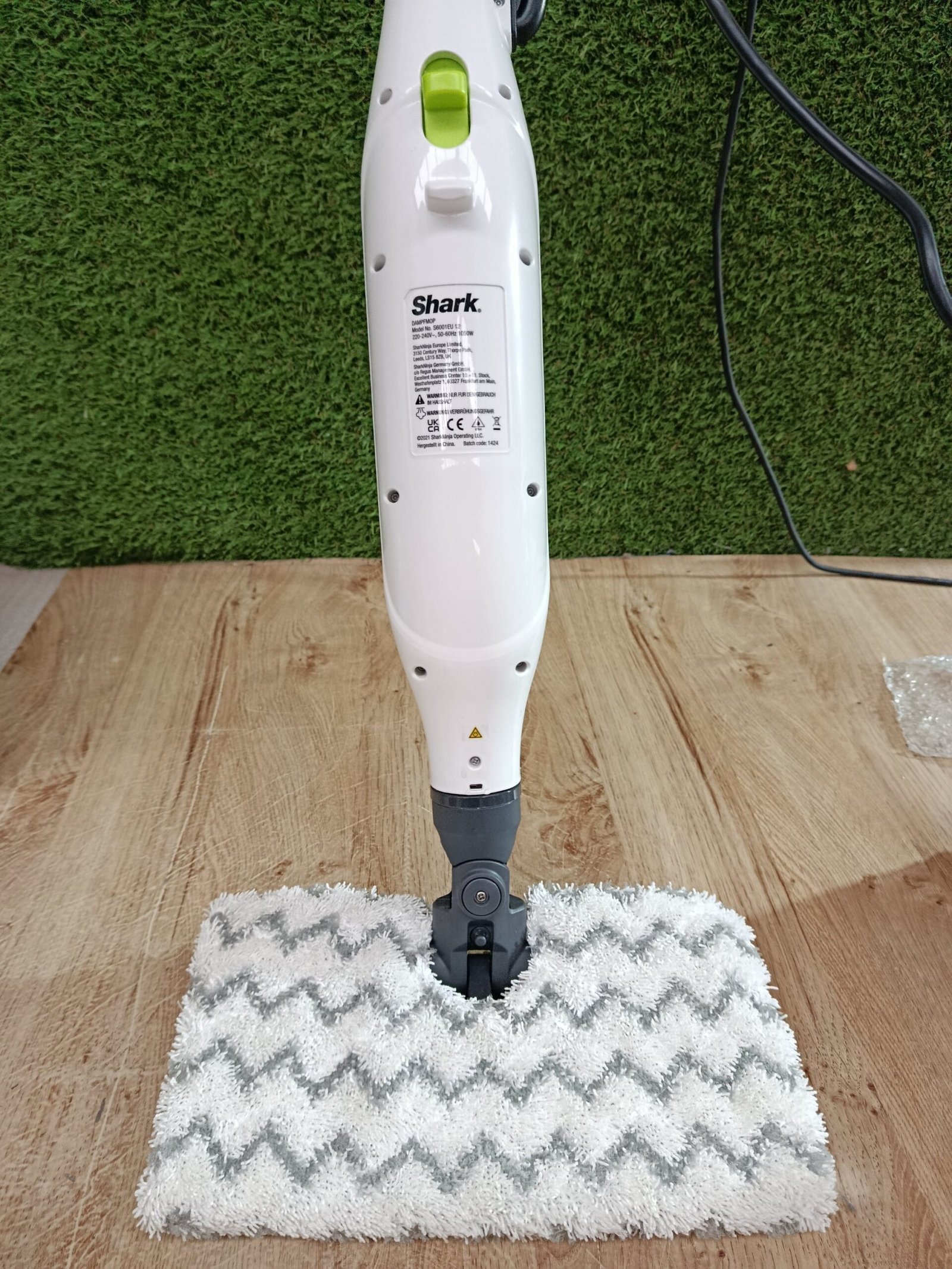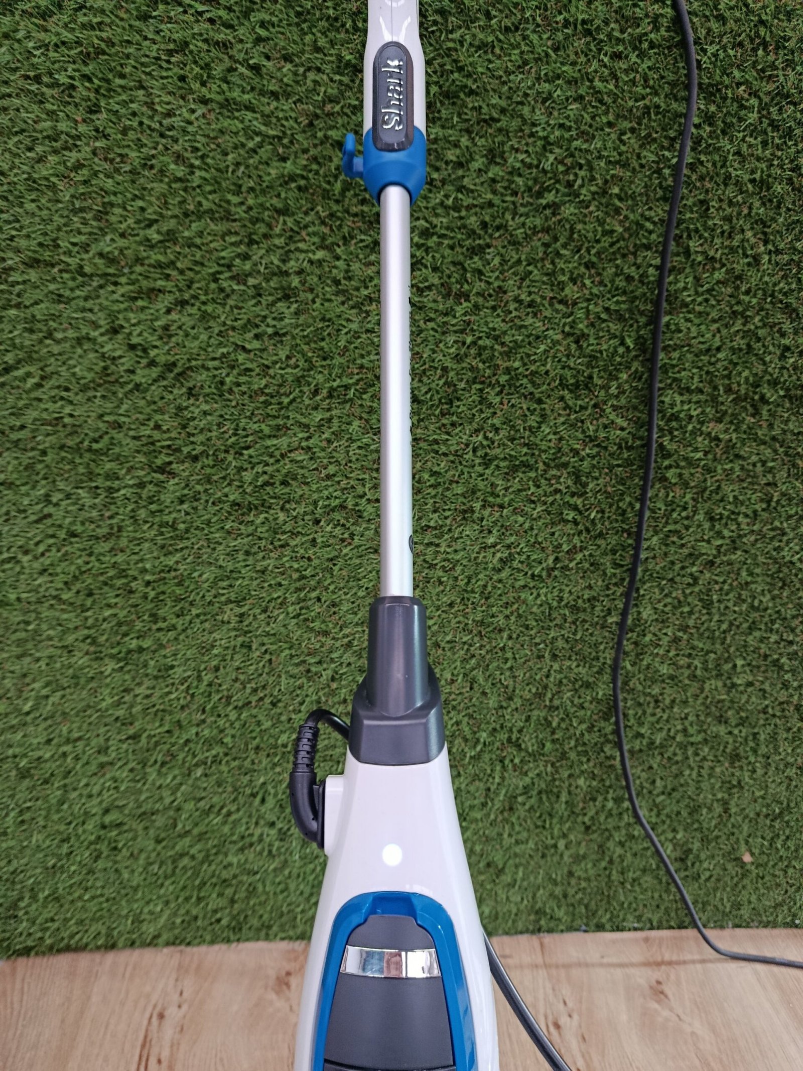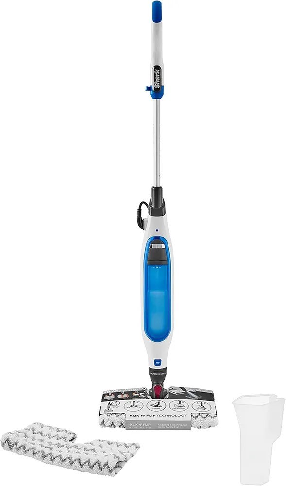 Shark Mopa de vapor Klik n’ Flip, 350 ml de capacidad, Steam Baster, 2 almohadillas de limpieza lavables a máquina, vaso de llenado, cable de 6 m, calentamiento en 30 s, en blanco y azul, S6001EU