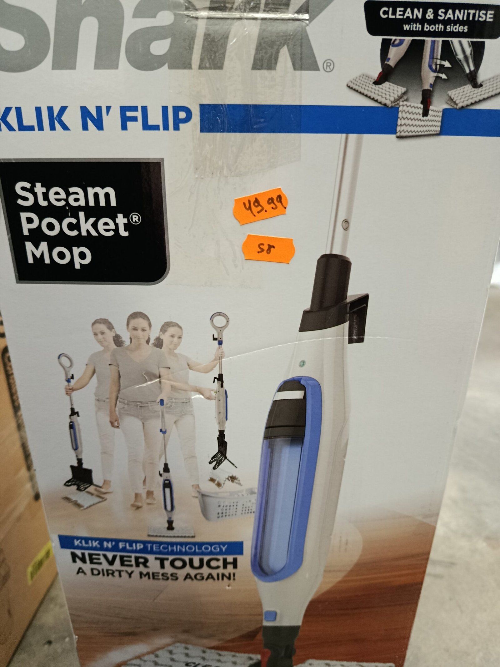 TECNOLOGÍA KLIK N’ FLIP: Poder de limpieza a doble cara. Dale la vuelta al cabezal de la mopa para limpiar el doble de superficie y luego libera la almohadilla de limpieza lavable a máquina con un simple gesto sin usar las manos.