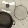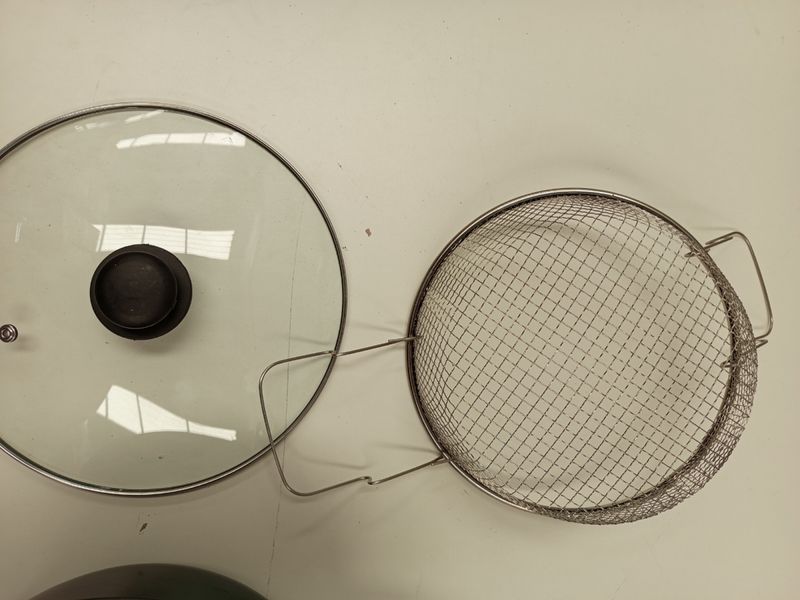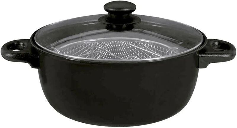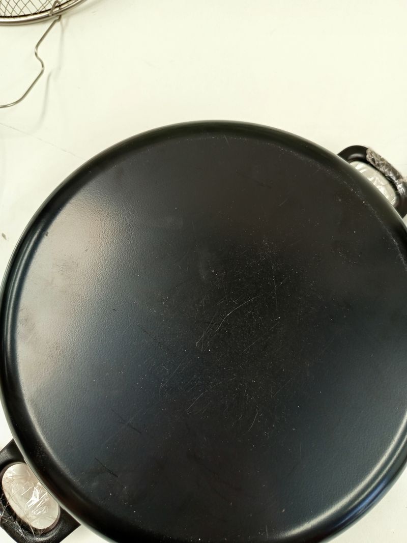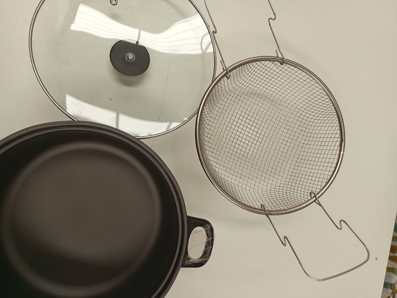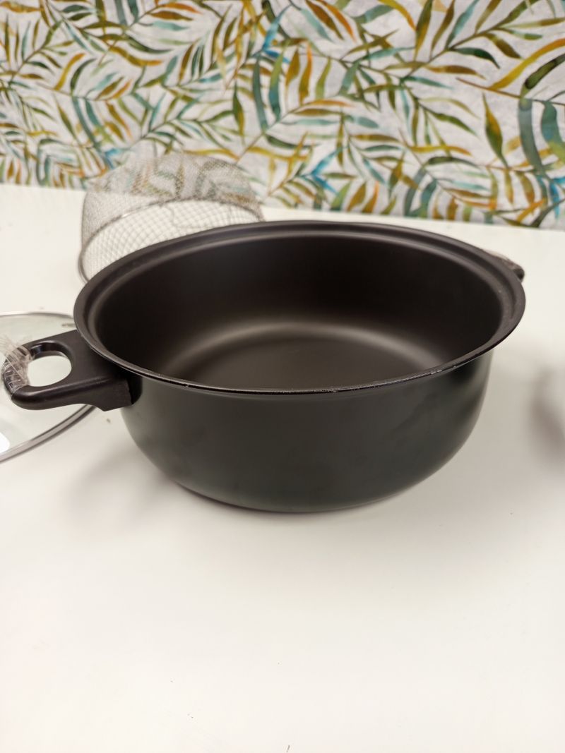 Olla freidora de acero, color negro, con capacidad de 3,2 litros y 26 centímetros de diámetro. Incluye cesta de acero inoxidable y tapa de cristal. Está en buen estado. – Ideal para freír alimentos de forma saludable. – Perfecta para cocinar para varias personas. – Fácil de limpiar.