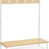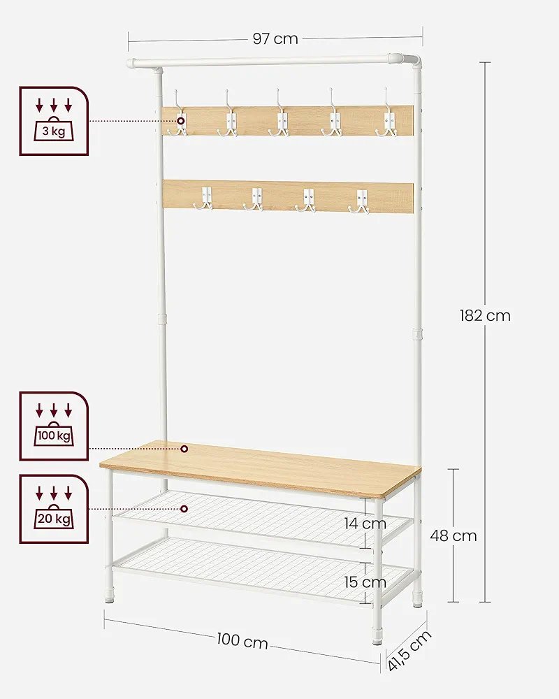 Al volver a casa, colgar tu abrigo, sombrero y bufandas en uno de los 4 ganchos dobles o 5 ganchos triples, siéntate en el banco de 100 cm de ancho para quitarse los zapatos y guárdalos en los 2 estantes de rejilla