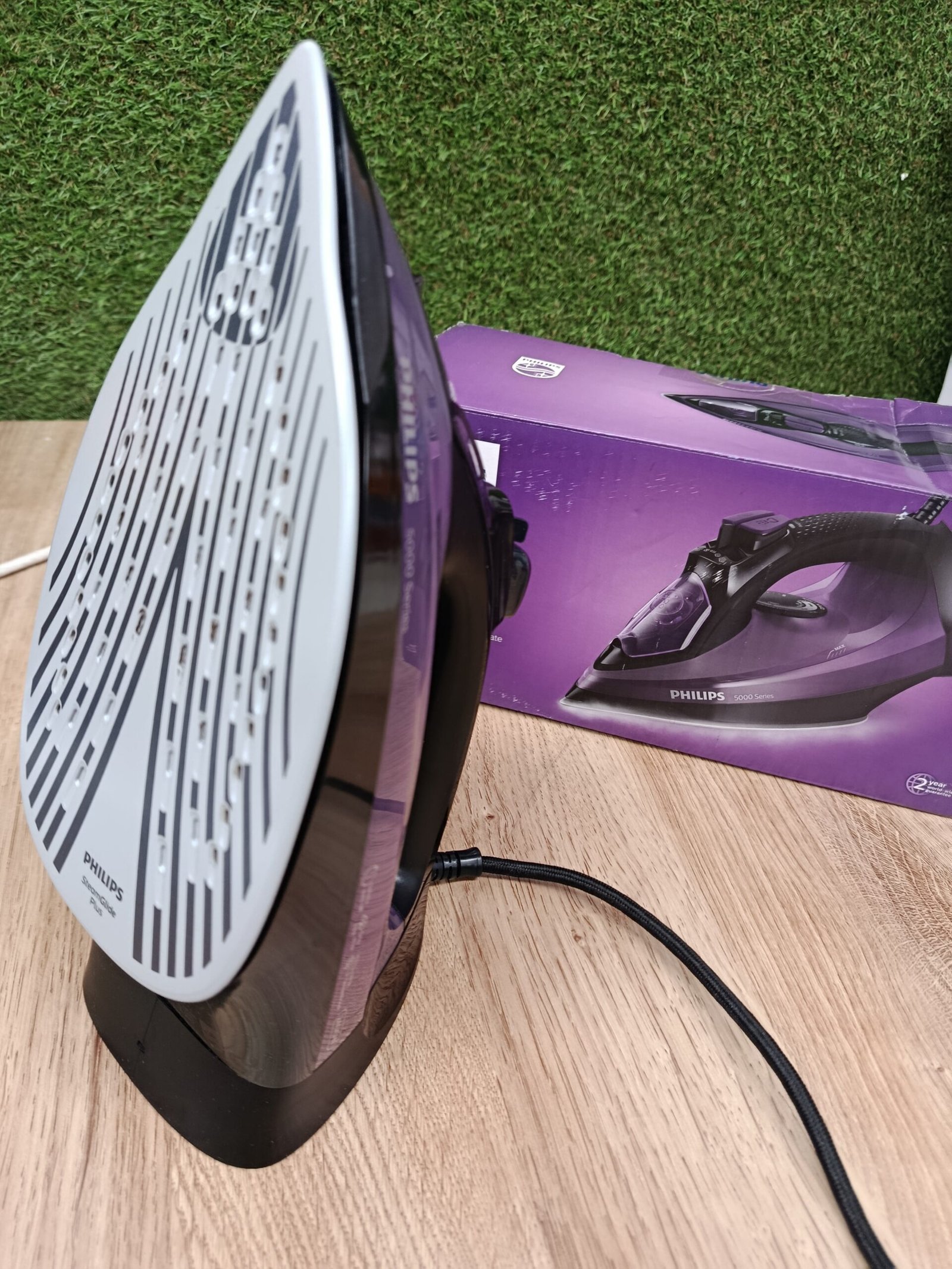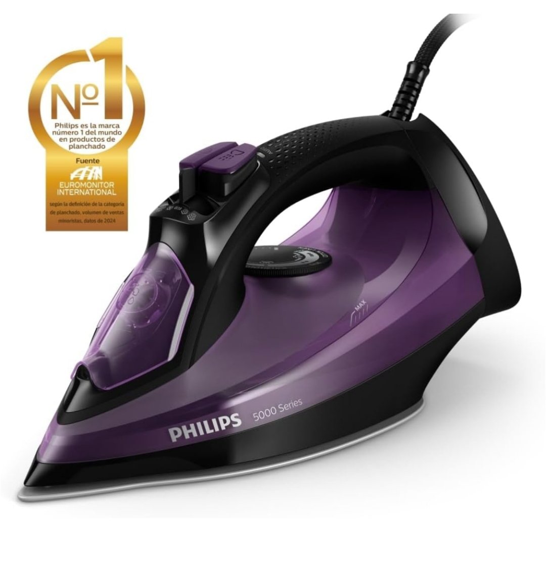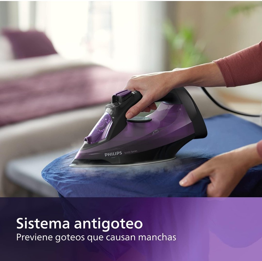 Philips Serie 5000 Plancha de Vapor, 2400W de Potencia, 45g/min, Golpe de Vapor 180g, Vapor Vertical, Suela SteamGlide Plus, Negro/Púrpura (DST5030/80)