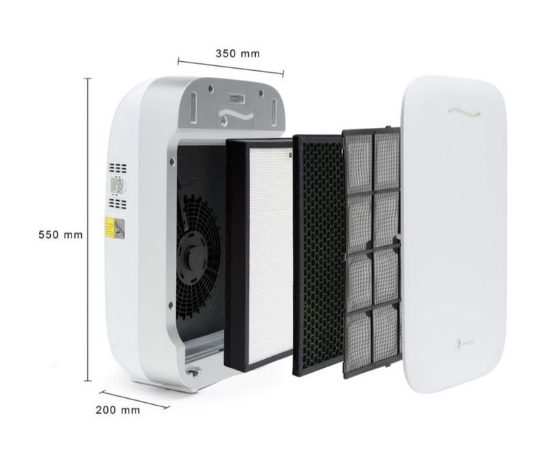 Pre-filtro elimina los elementos más grandes, el filtro de desodorización con carbón activo absorbe los químicos nocivos como tvoc y formaldehido y el filtro hepa elimina las partículas de hasta 0.3 micras con una eficiencia del 99,97%.