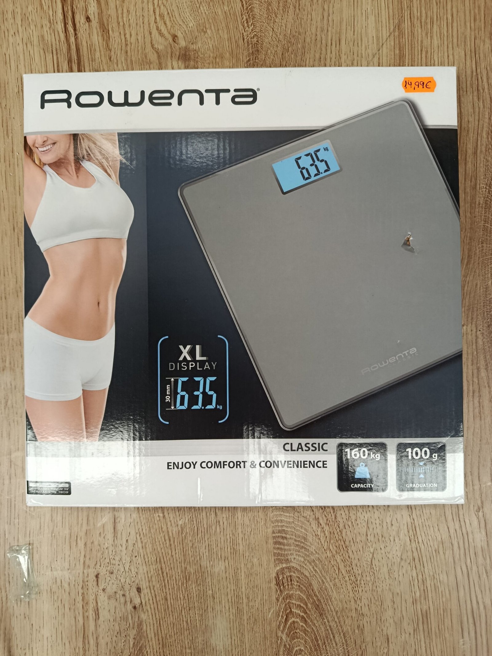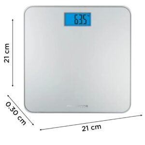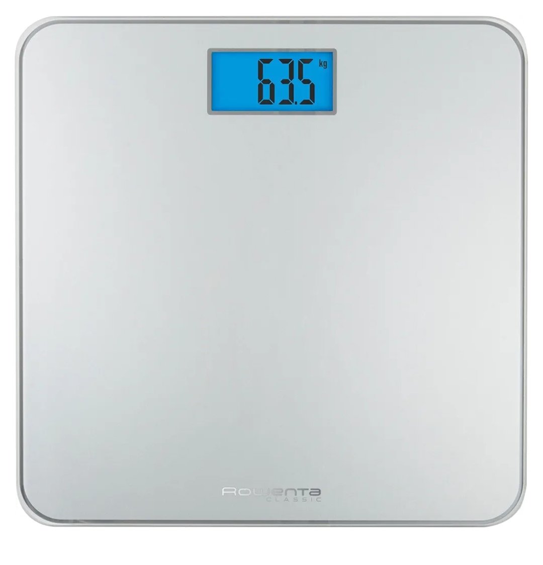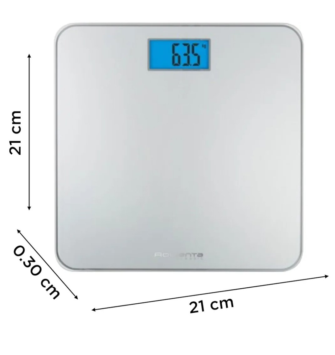 Rowenta Classic BS1500 – Báscula de baño con Pantalla LCD, Compacta, Capacidad de 160 kg, Plataforma de Vidrio y Apagado Automático que Incluye Pilas, color plata