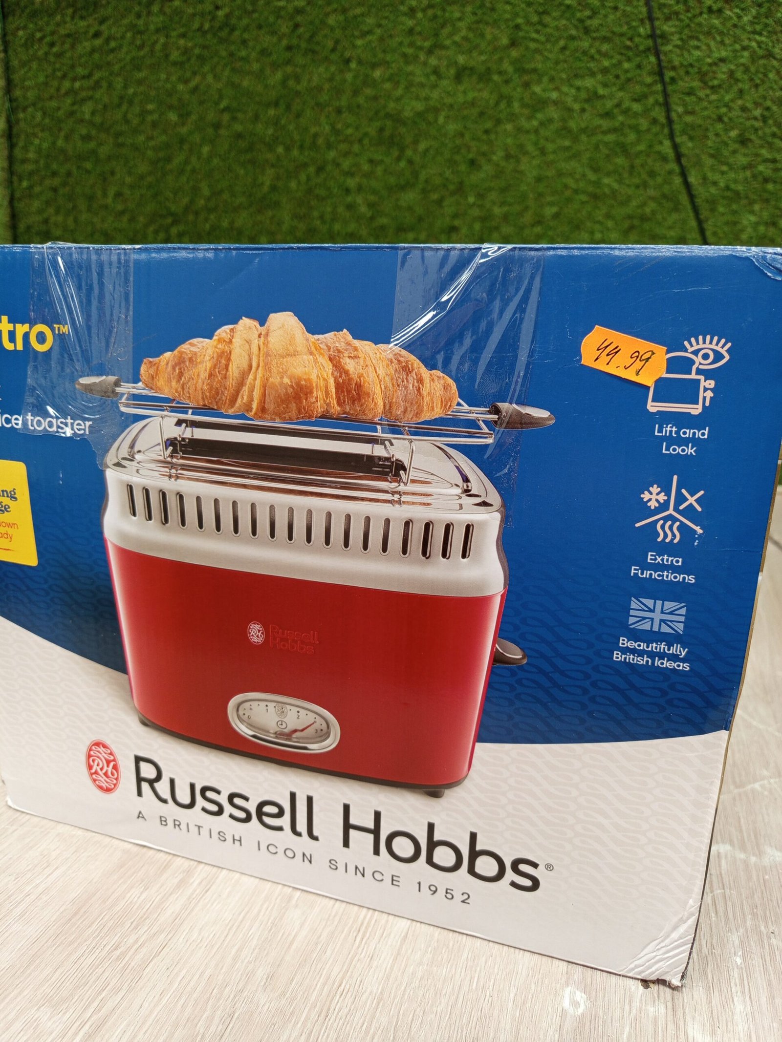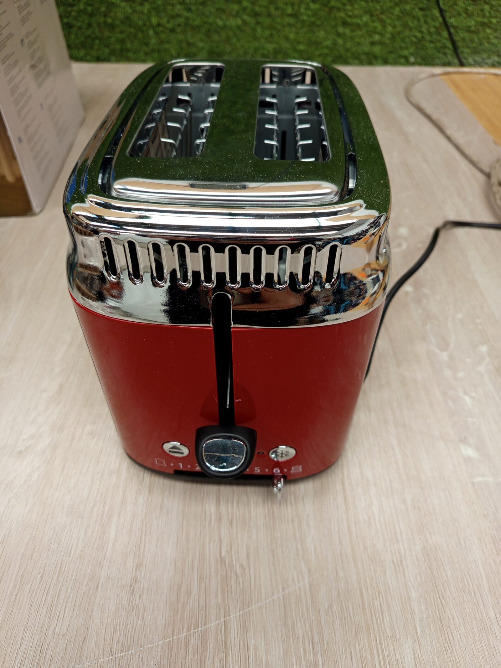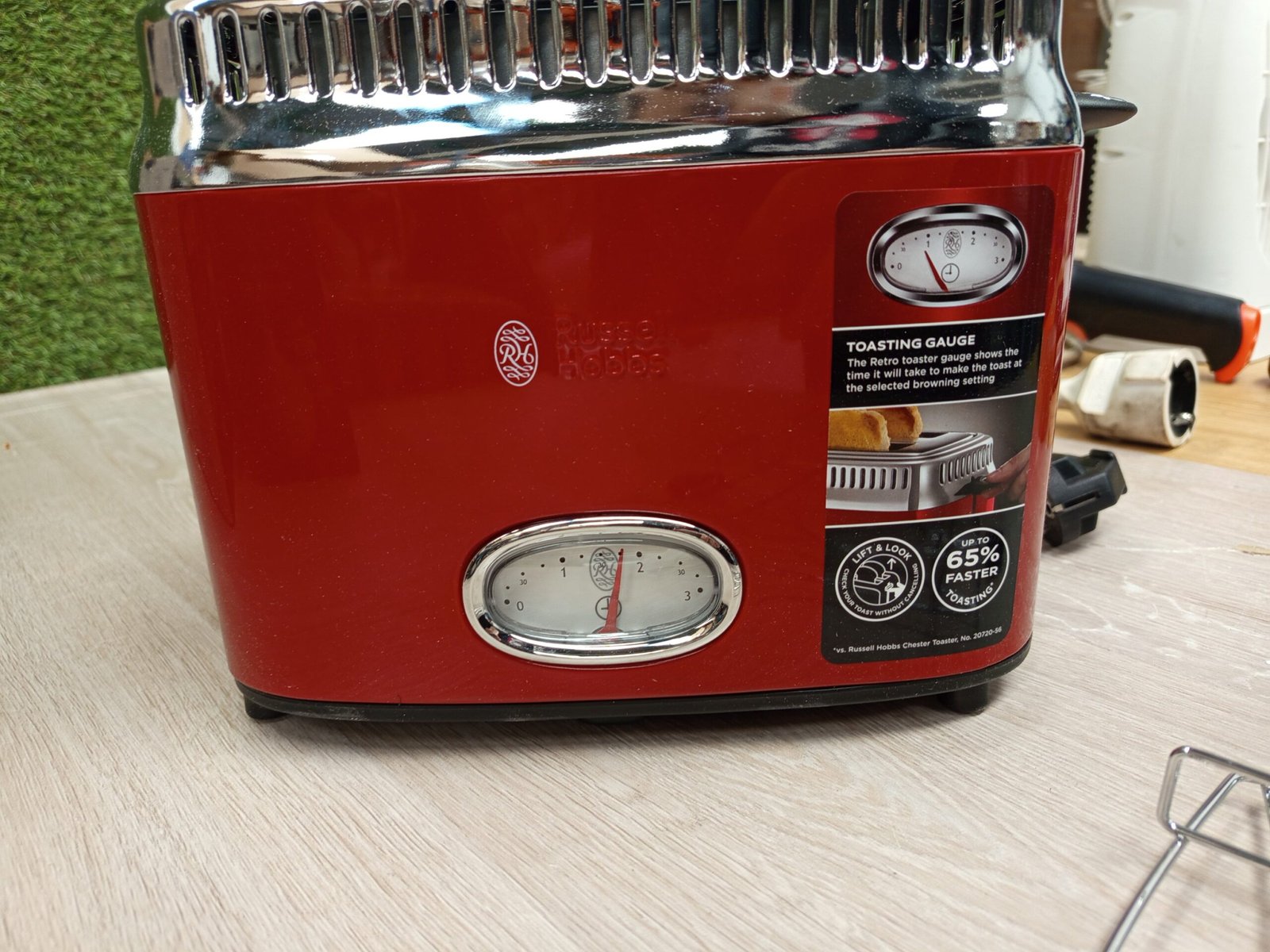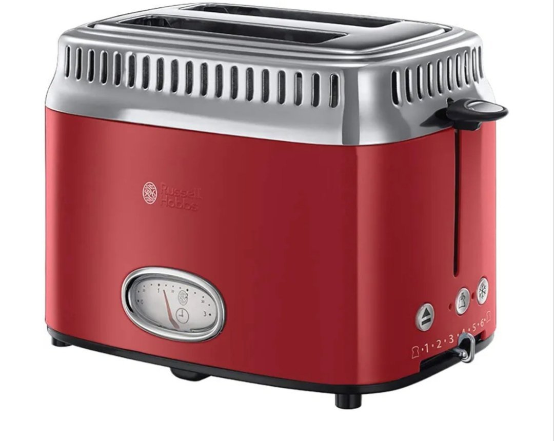 Russell Hobbs Tostadora Retro – 2 Ranuras Cortas y Anchas, Tostador para 2 Rebanadas, Bandeja Recogemigas, Calientapanecillos, Función Descongelar, Diseño Vintage, Acero Inoxidable, Rojo