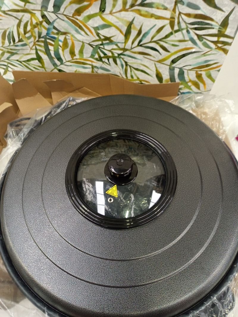 Sartén de aluminio con revestimiento antiadherente y asas con aislamiento térmico; incluye una tapa de aluminio y cristal con orificio de salida de vapor y un tirador de plástico aislante de temperatura